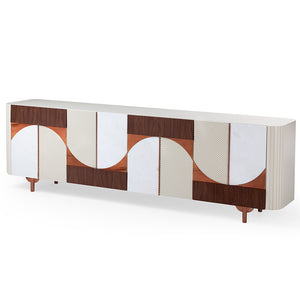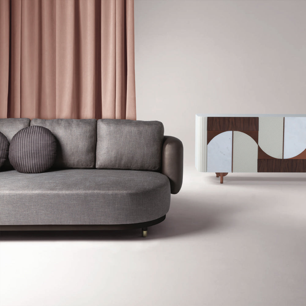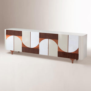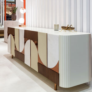 Metropolis Sideboard is an elegant and evocative cabinet embodying the elegance, fine craftsmanship and richness of Art Deco by striking the perfect balance between multiple contrasts: soft curvy shapes against straight lines, polished metals against natural wood and marble.