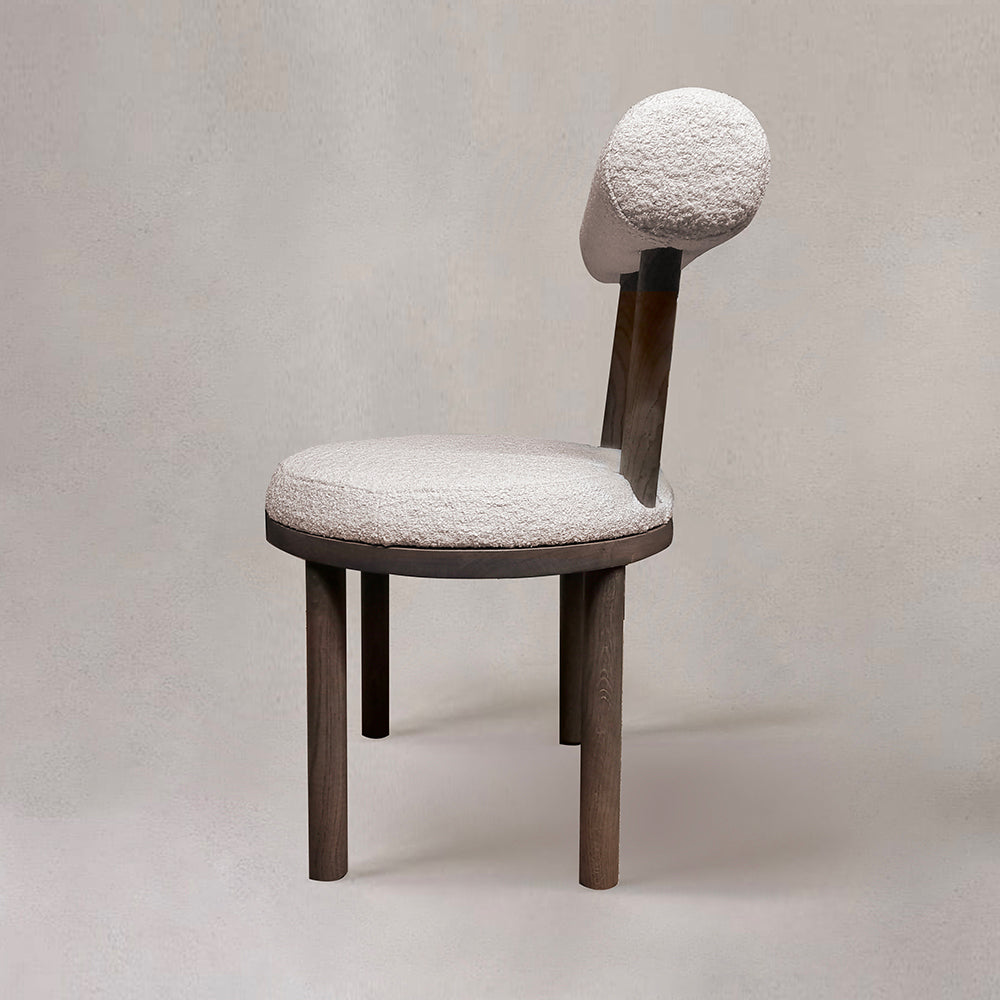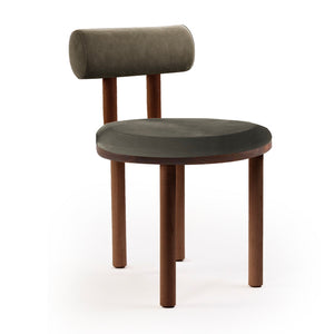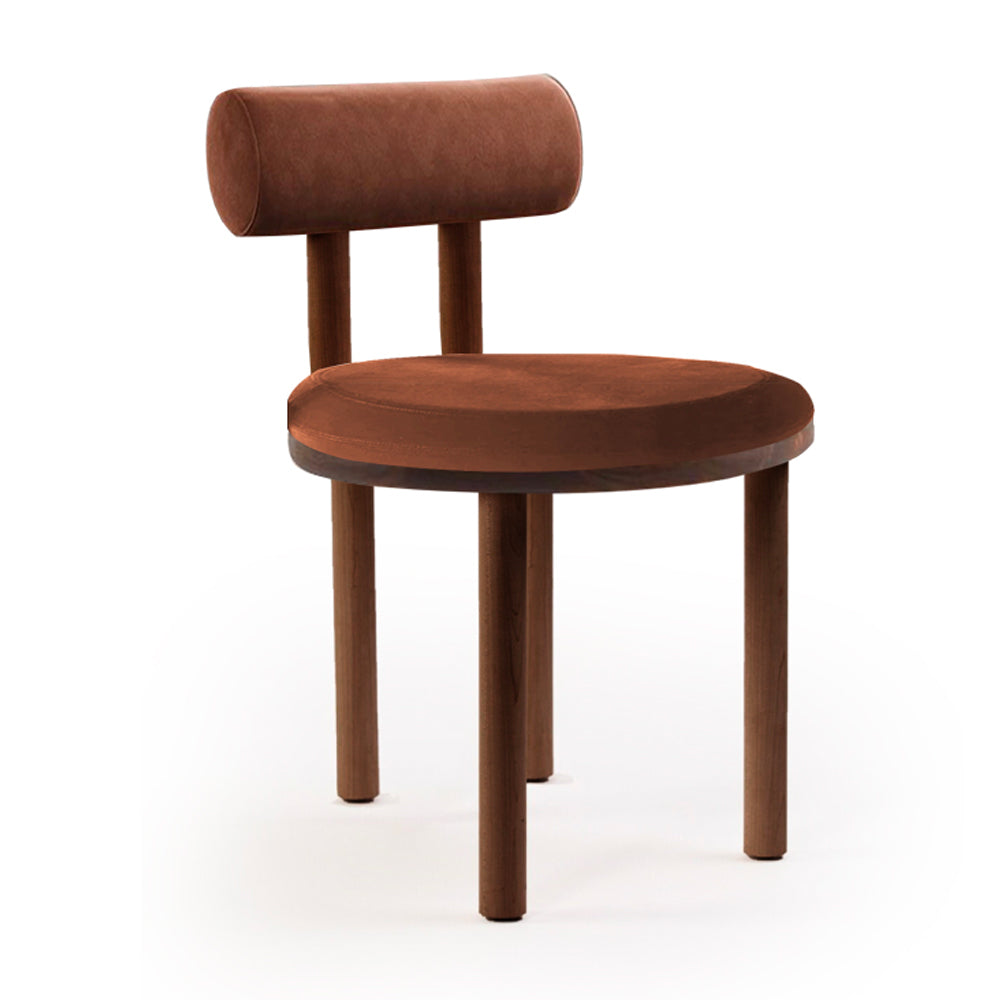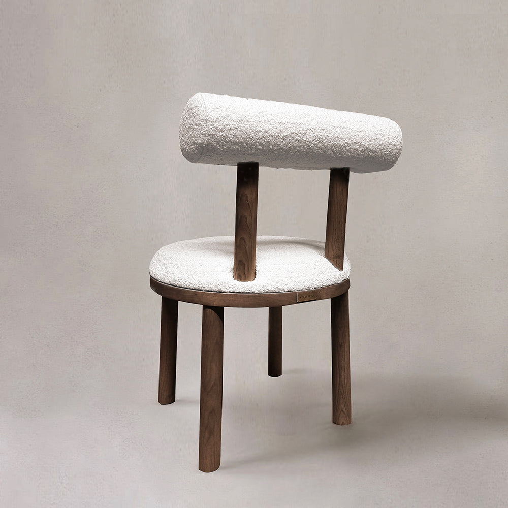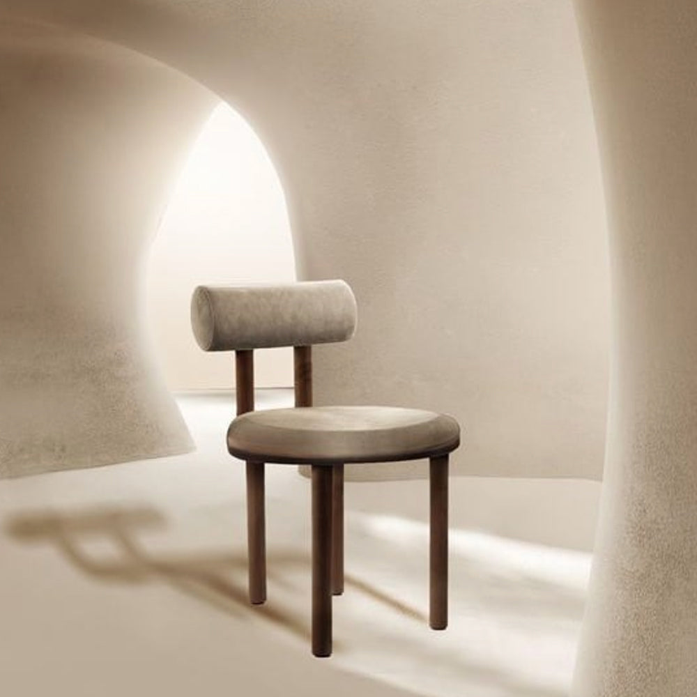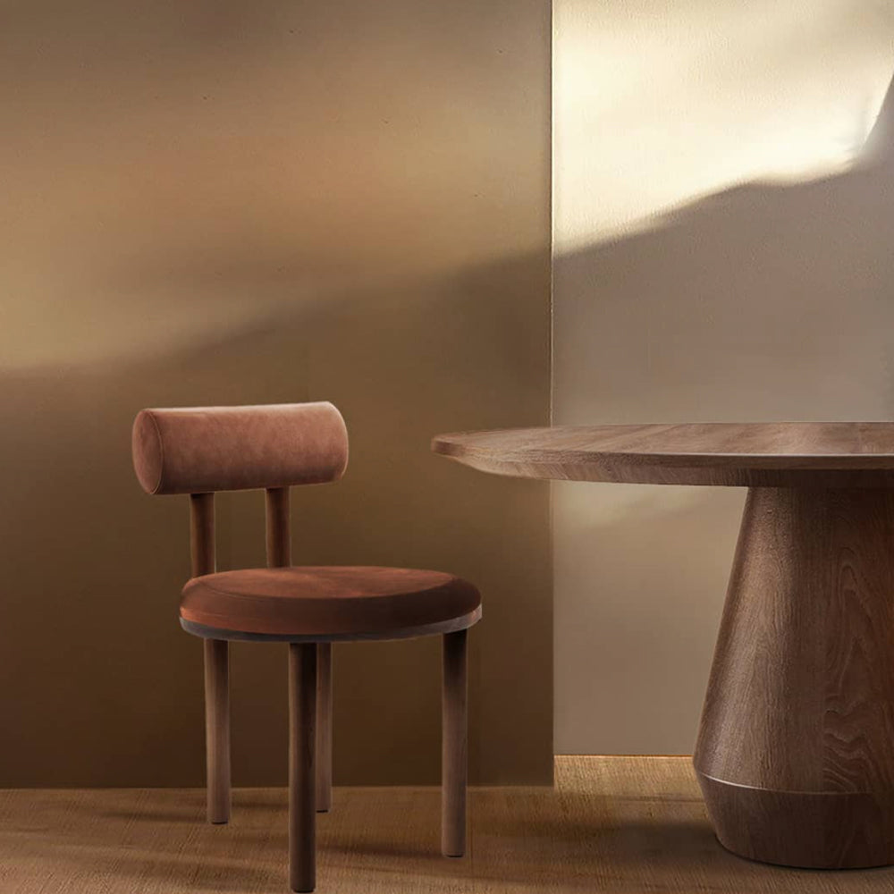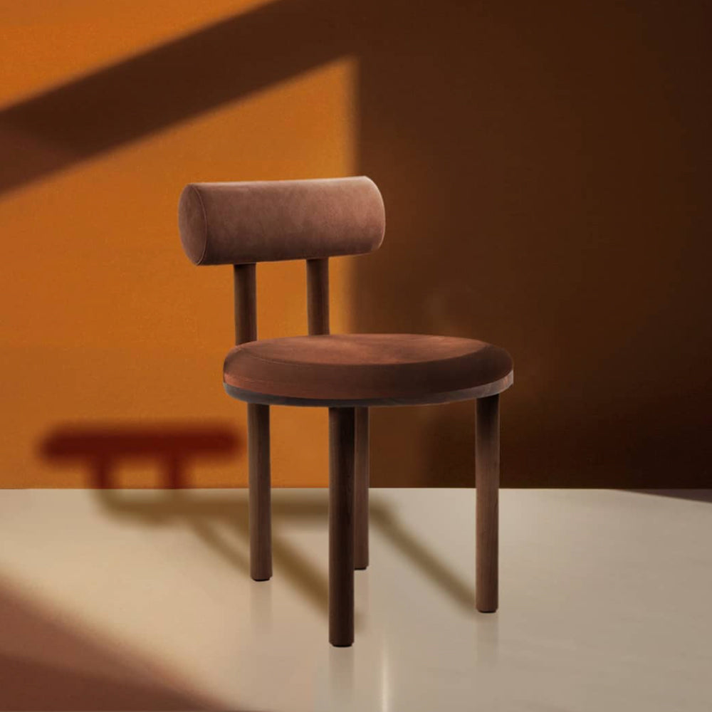 The Moca Chair is a sculptural and comfortable chair with a design featuring a solid wood frame with a tubular upholstered backrest which recalls a tree trunk. The Moca stool mixes both modern and classical design approaches, as well as combining style and comfort.