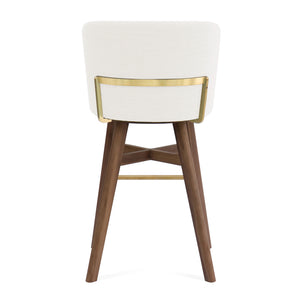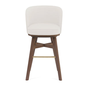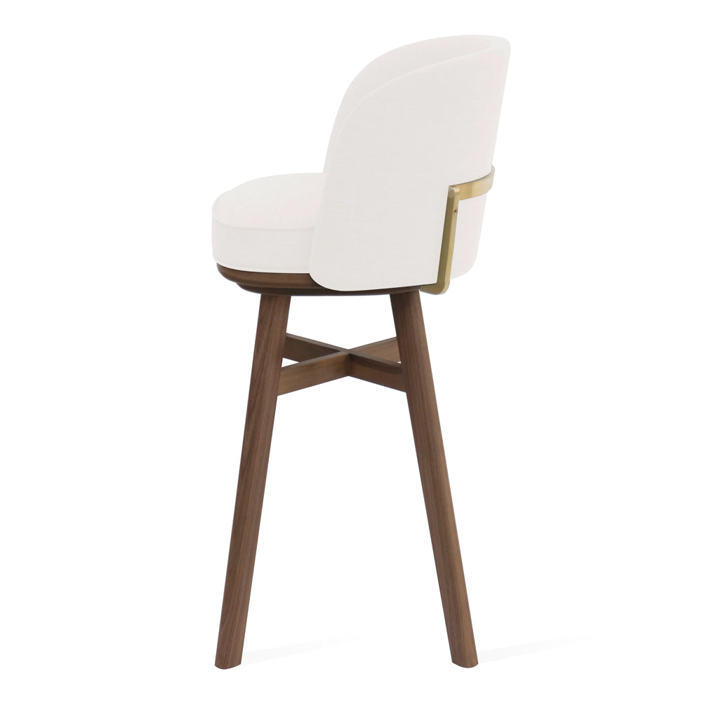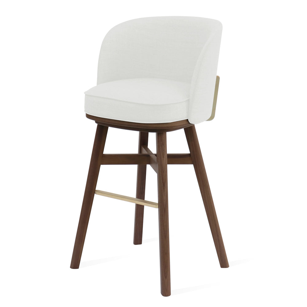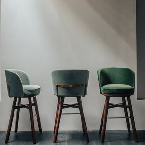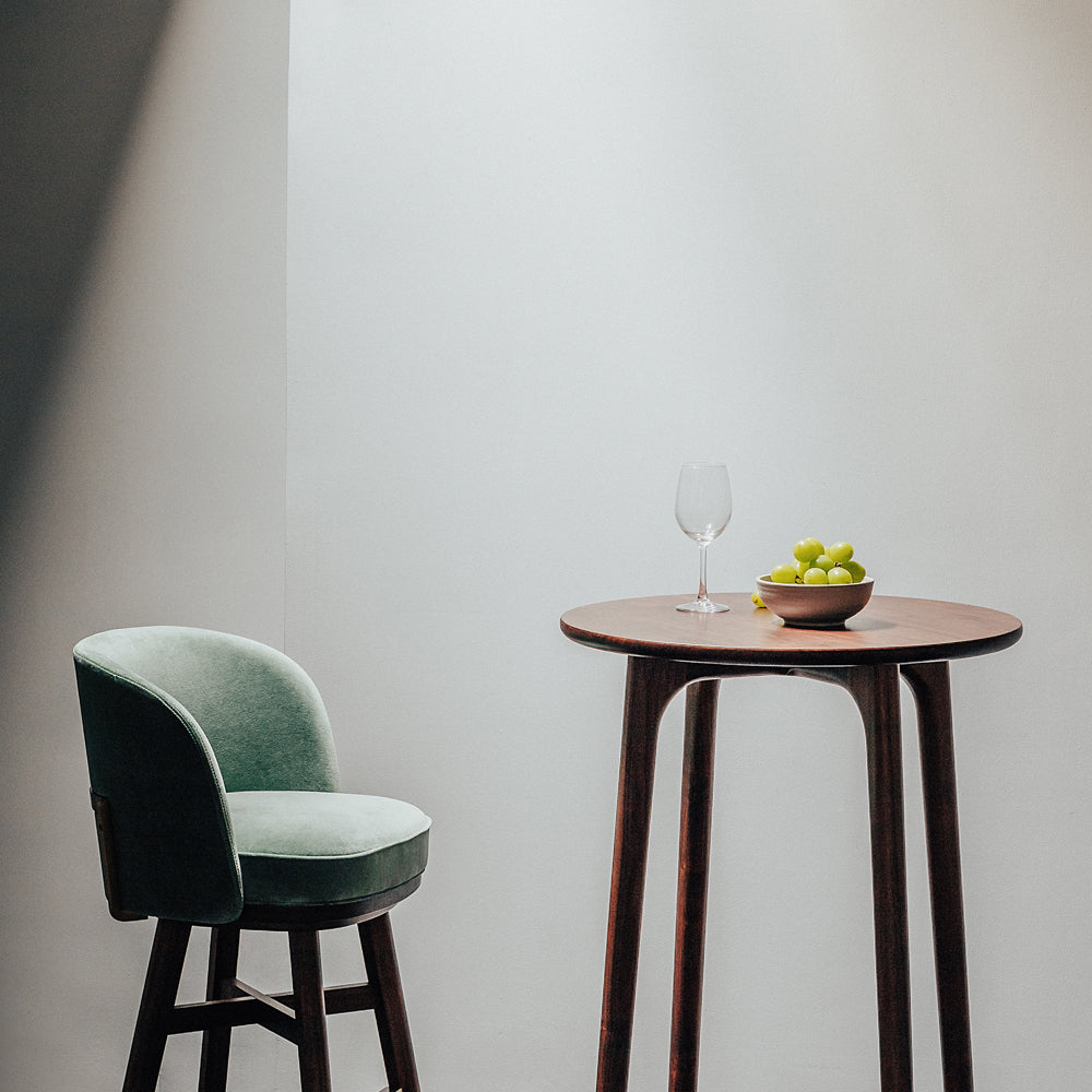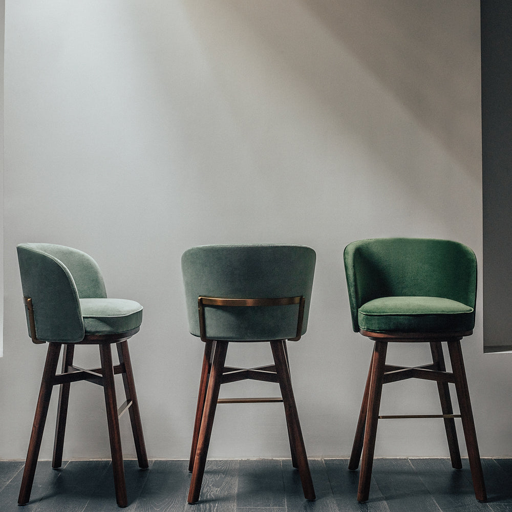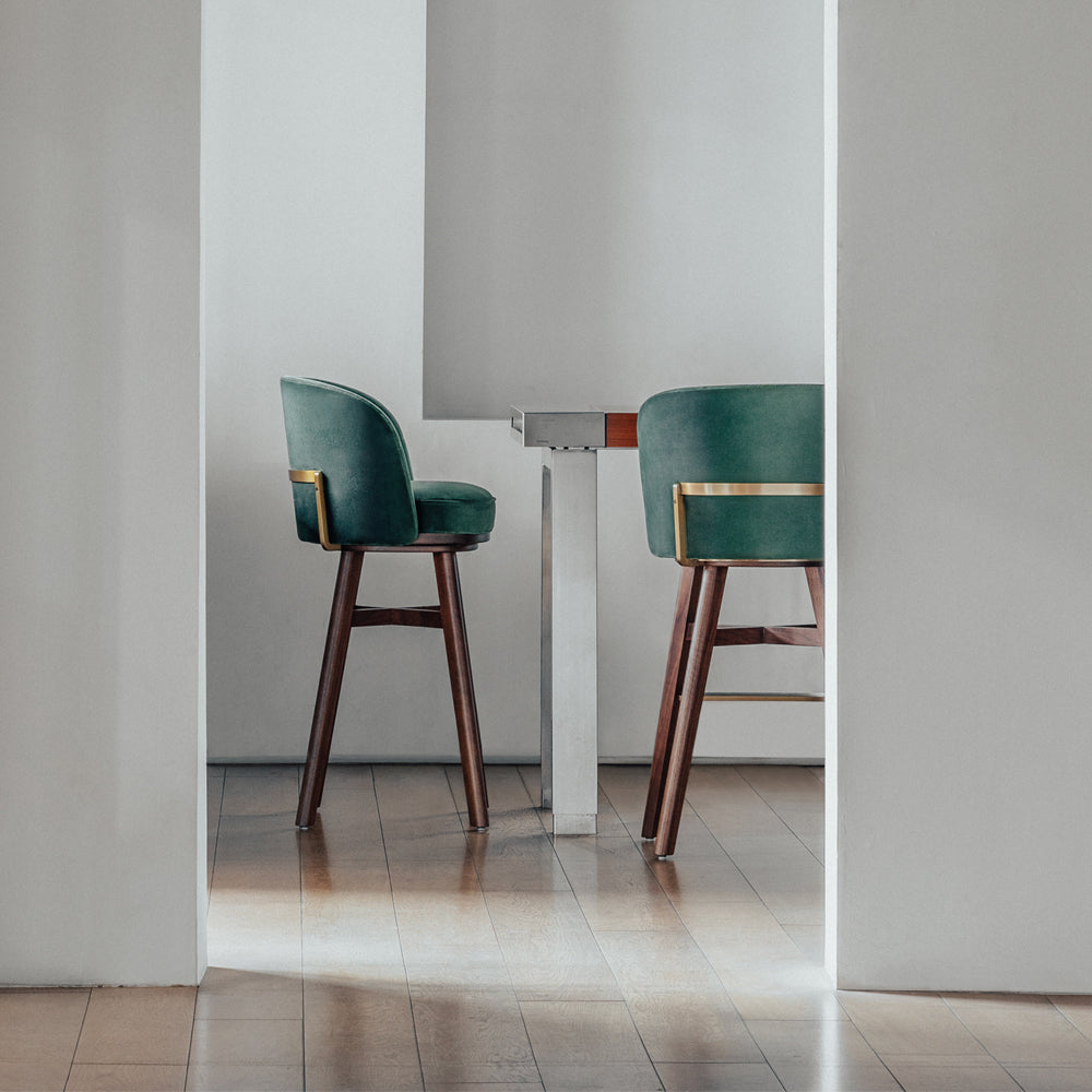 The Mr.B Swivel Bar Chair is inspired by Shanghai's iconic Bund, where the old rich history seamlessly merges with modern life. The Mr. B collection reflects an harmonious blend of Eastern and Western cultures. The Mr. B collection includes of a dining chair, a lounge chair, a swivel bar chair, and a two-seater chair. All products have a solid wooden frame and are fully upholstered in a wide variety of leather or fabric choices.