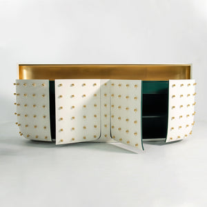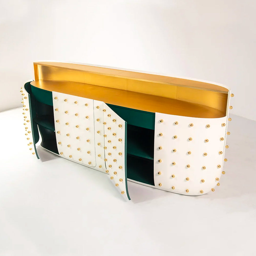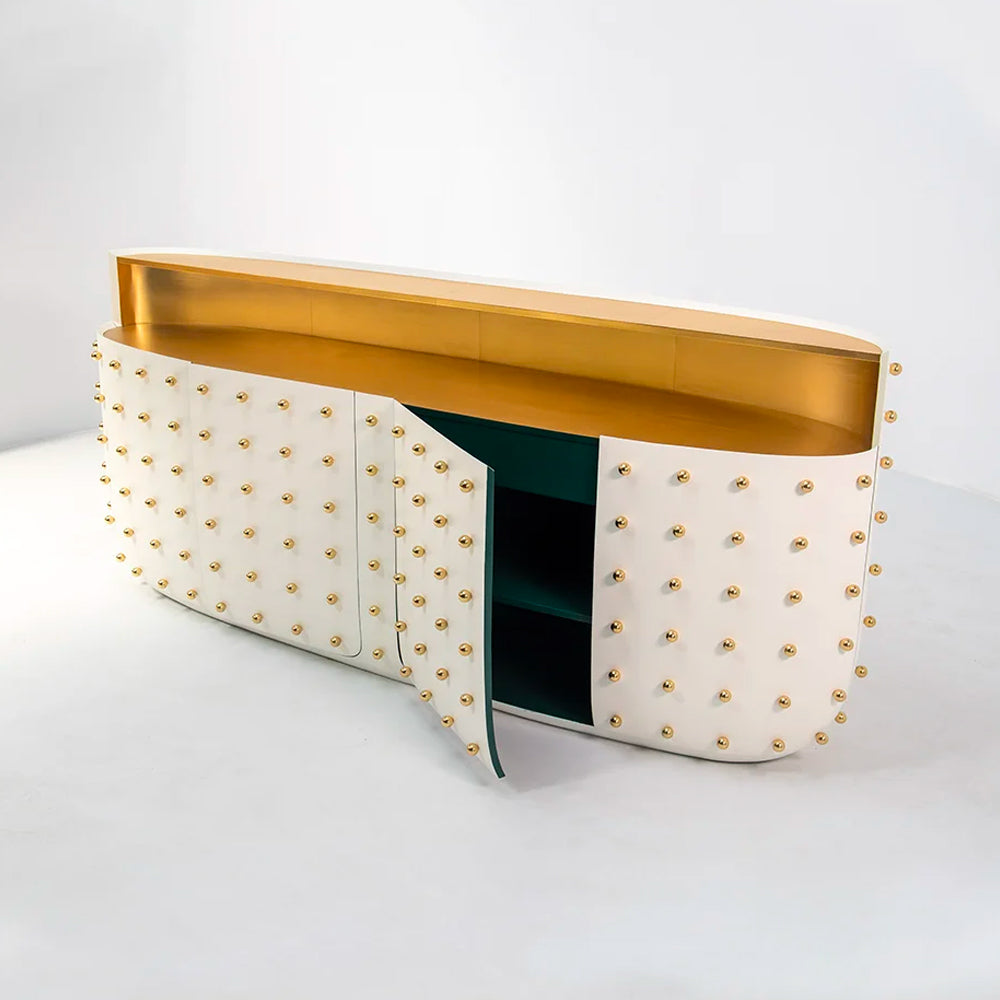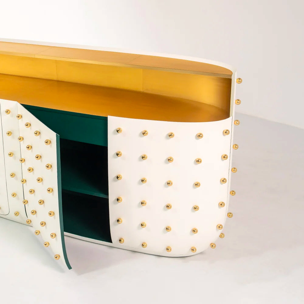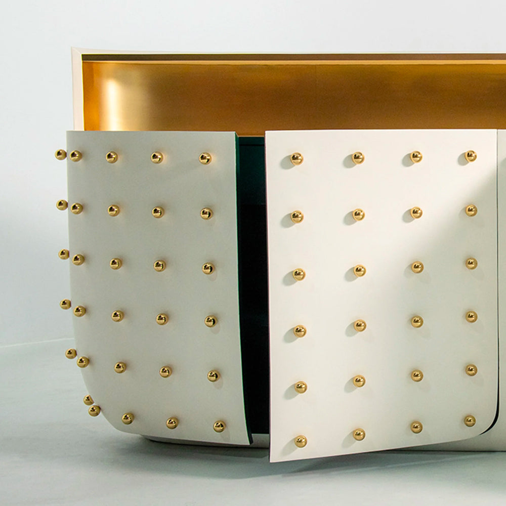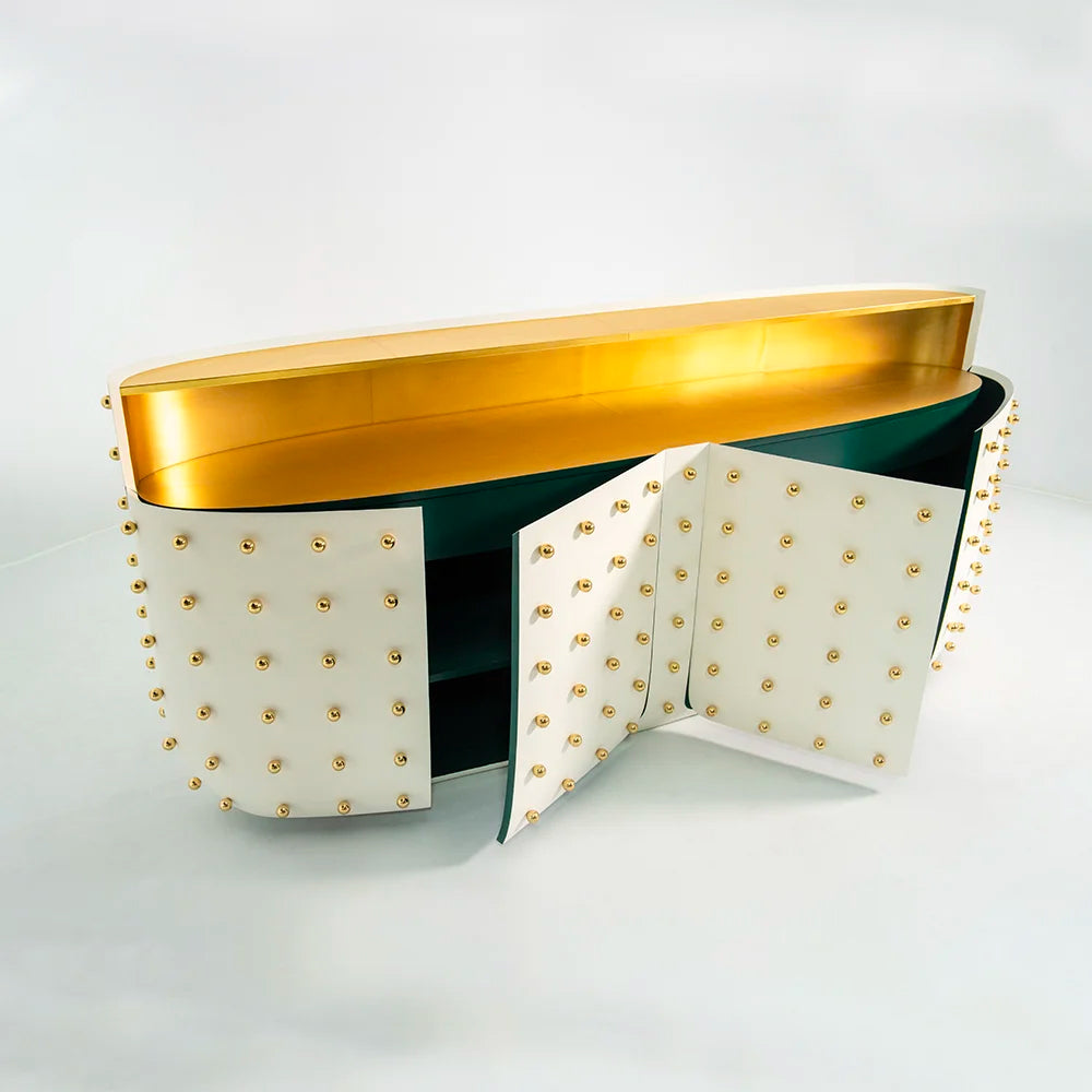The Oasis Bar Cabinet is an irresistibly quirky bar. The gleaming brass spheres on the Oasis Bar Cabinet are reminiscent of a marvellous white succulent. The exterior is available in pristine white with a brass top. The Oasis Bar Cabinet is indeed a fully functional two-level cabinet with a guest side and a service side. It is studded with gleaming brass balls and has four doors with ample storage inside. Once opened, Oasis reveals two spacious storage compartments within, containing a generous interior, comprising shelves and bottle holders. The Oasis Bar Cabinet is available in one finish: Oasis Sideboard White, with its pristine white and brass exterior and blue/green interior.