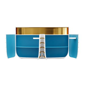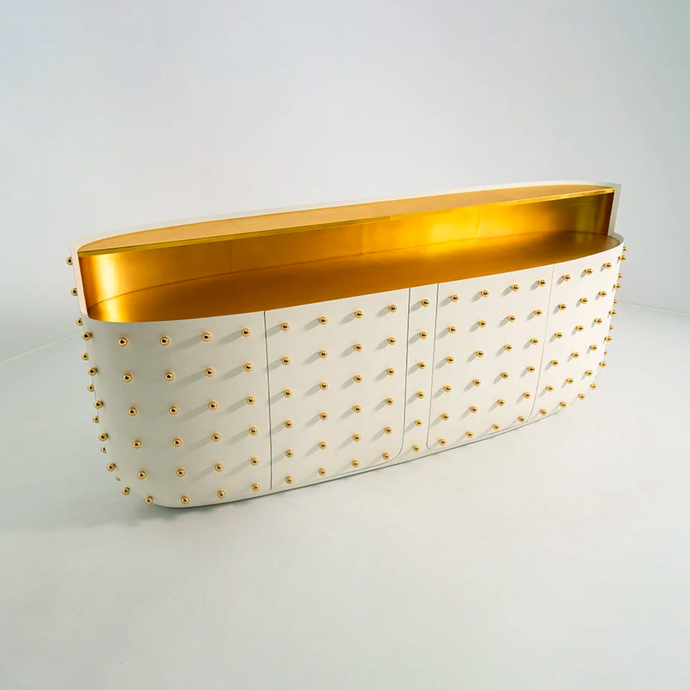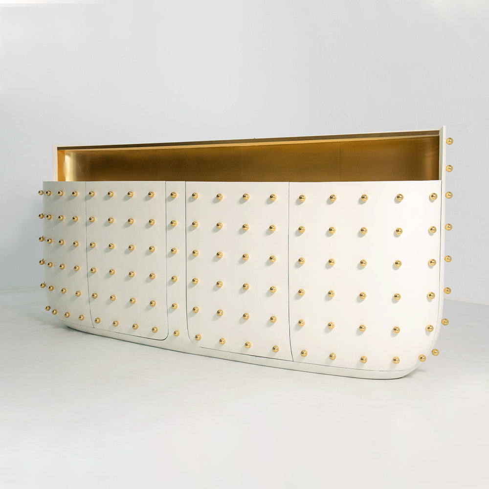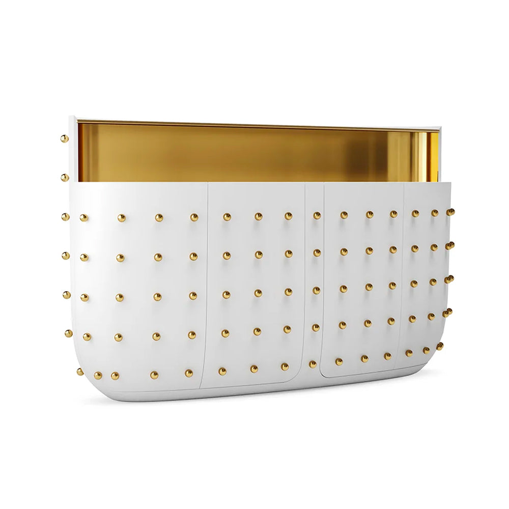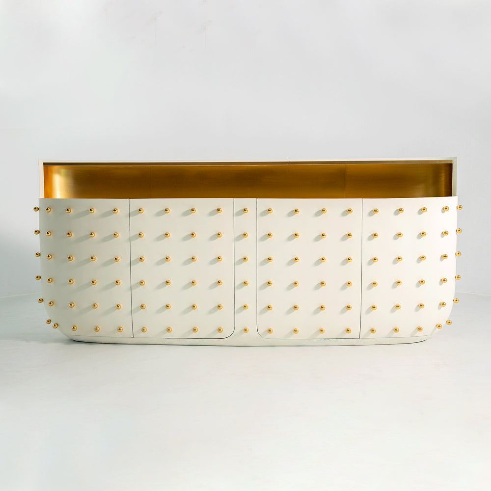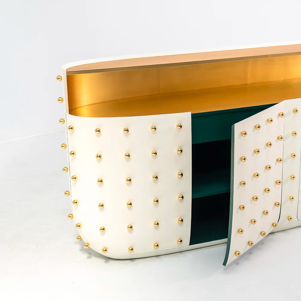 The Oasis Bar Cabinet is an irresistibly quirky bar. The gleaming brass spheres on the Oasis Bar Cabinet are reminiscent of a marvellous white succulent. The exterior is available in pristine white with a brass top. The Oasis Bar Cabinet is indeed a fully functional two-level cabinet with a guest side and a service side. It is studded with gleaming brass balls and has four doors with ample storage inside. Once opened, Oasis reveals two spacious storage compartments within, containing a generous interior, comprising shelves and bottle holders. The Oasis Bar Cabinet is available in one finish: Oasis Sideboard White, with its pristine white and brass exterior and blue/green interior.