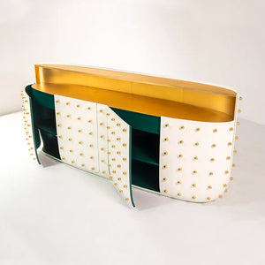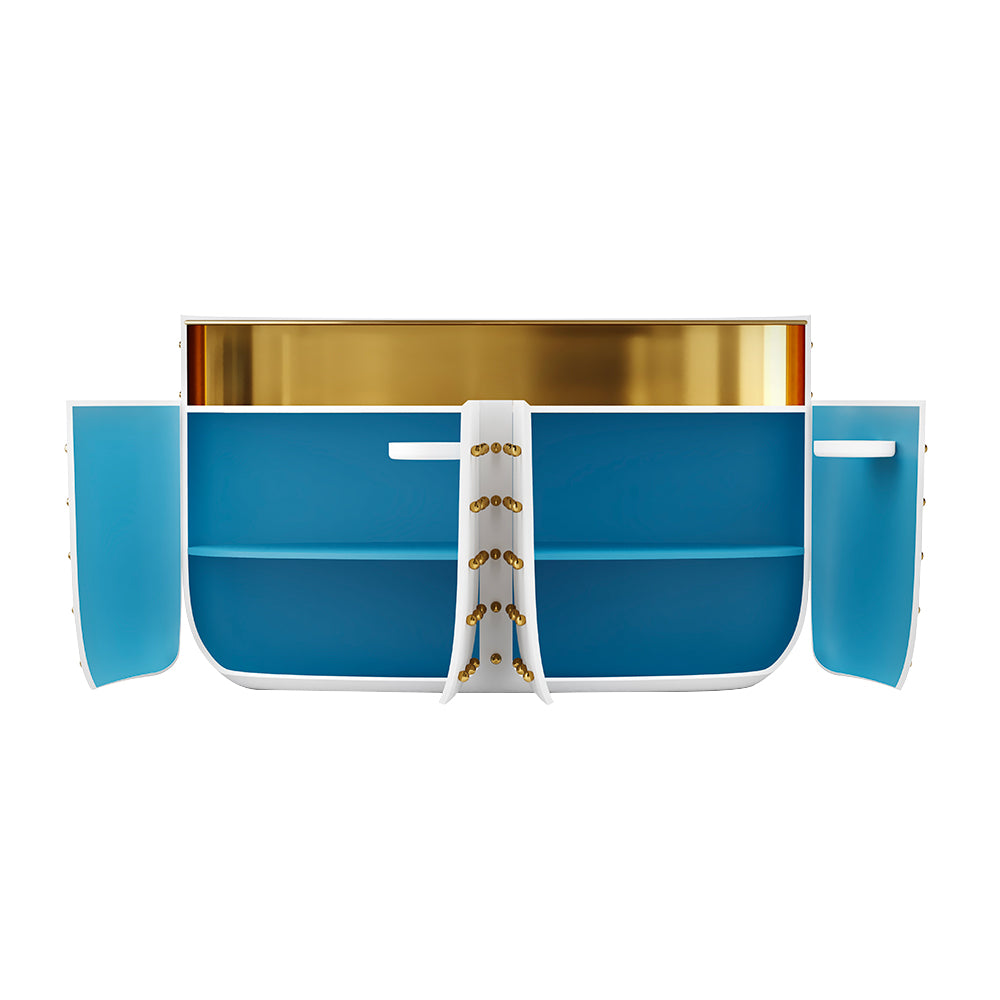 Finishes: Oasis Sideboard White: with its pristine white body and brass top exterior, brass finish top and blue/green interior