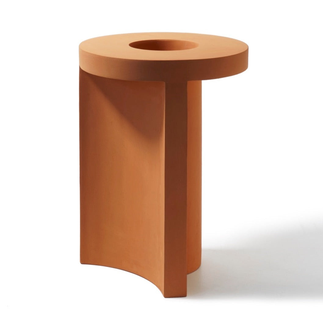 The Orpli Vase is a highly sculptural work of art. Echoing the Corinthian alabasters of the fifth century BC, Orpli is formed by a thin round tubular column surmounted by a very large disc. Added to this structure and acting also as a handle, is a semi circular veil of terracotta which accentuates the unique and sculptural design of this vase. The Expli Vase, the Inpli Vase and the Orpli Vase are perfect companions.