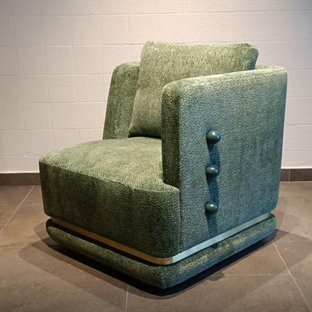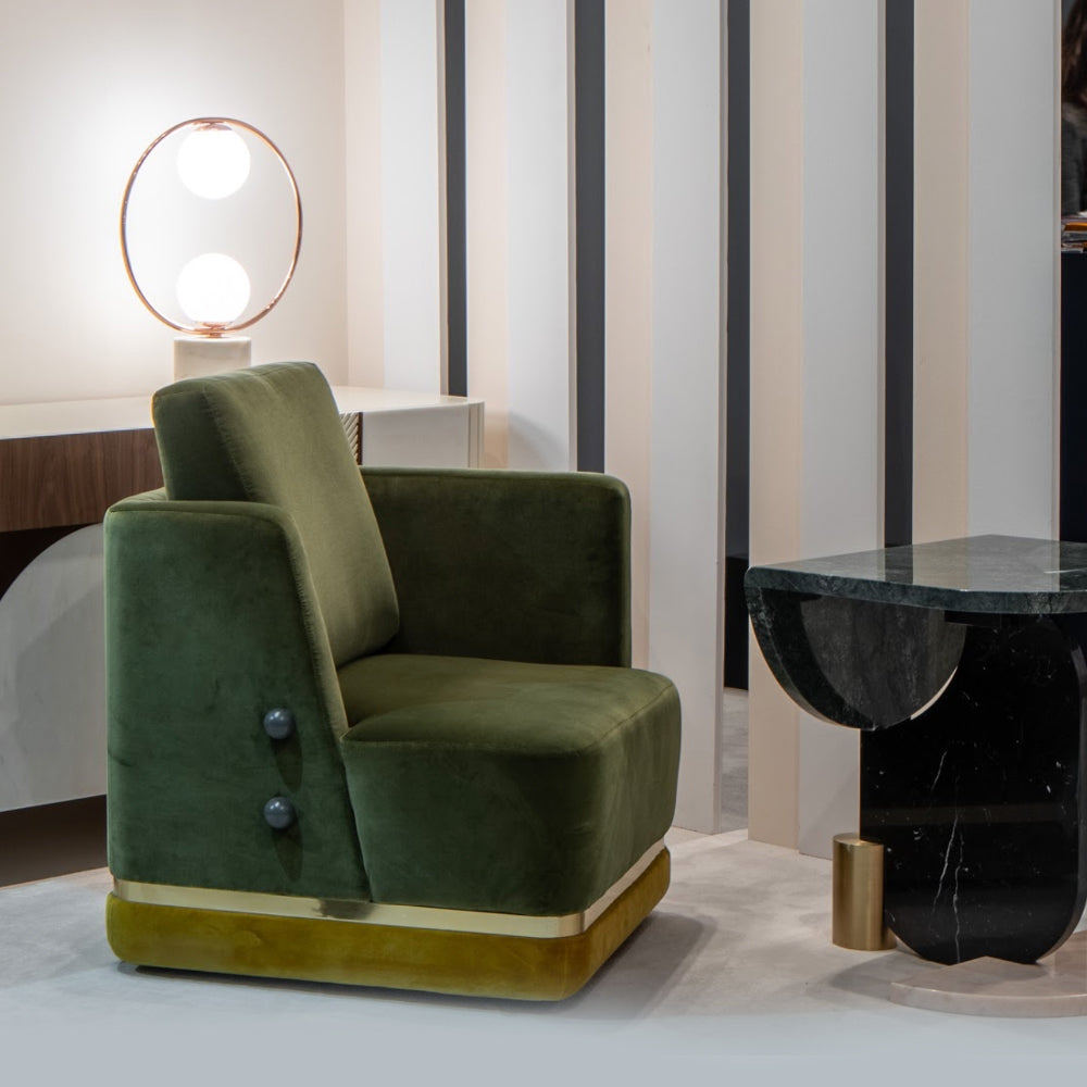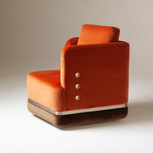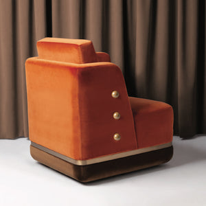Panorama Armchair is a sculptural and imposing armchair: its distinctive design features asymmetric arms and art deco details and it is inspired by Eastern Europe’s monumental architectural legacy. Its bold shape and aura of masculinity is balanced by the soft upholstery and inviting openness of the asymmetric arms, resulting in a unique armchair which is both visually intriguing and incredibly comfortable.