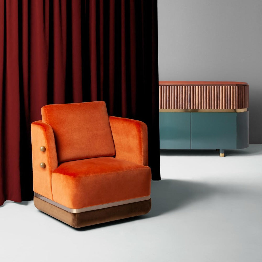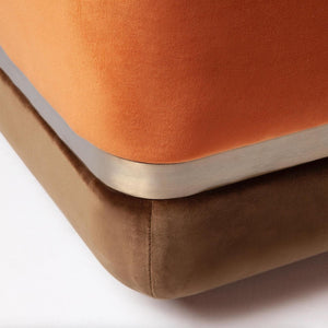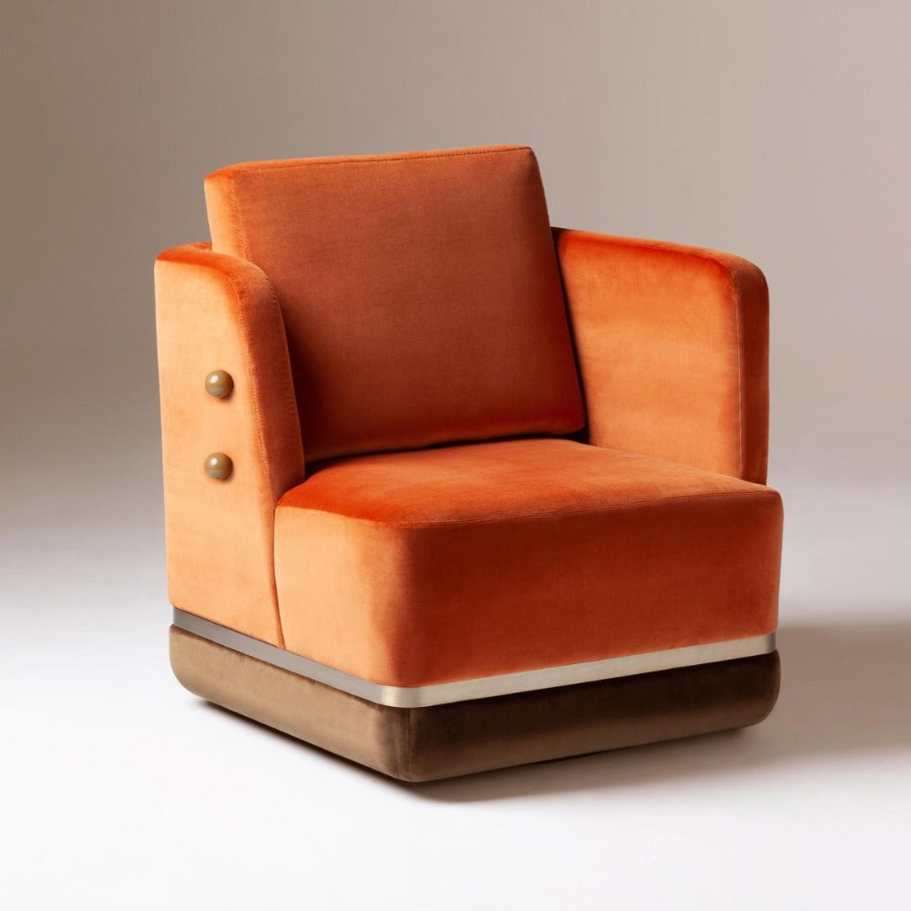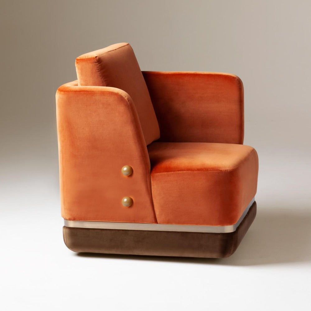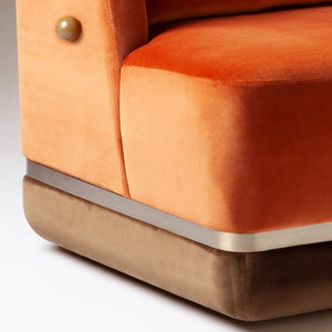 - First image: top upholstery and cushion in Velvet Terracotta; bottom upholstery in Velvet Woods; sphere applications in lacquered MDF mocha; metal applications in stainless steel plated polished brass