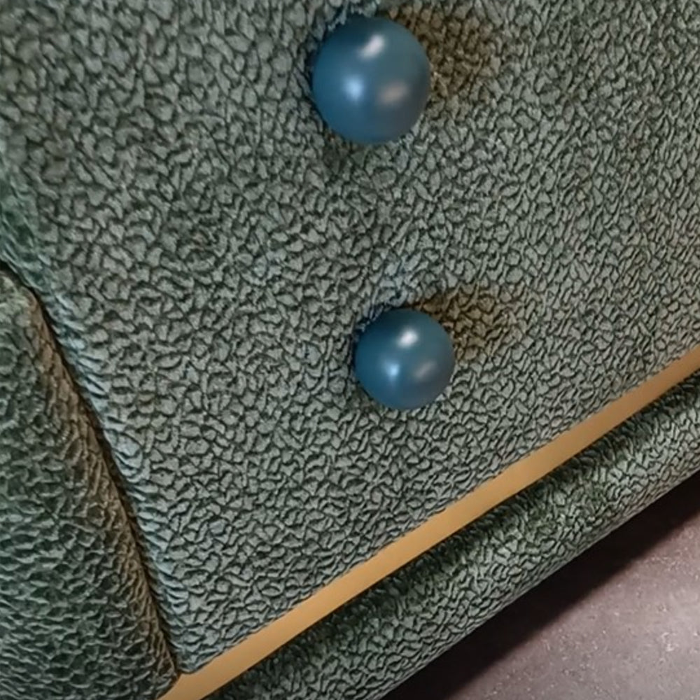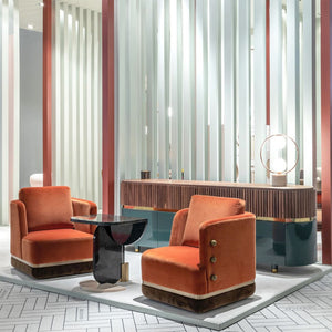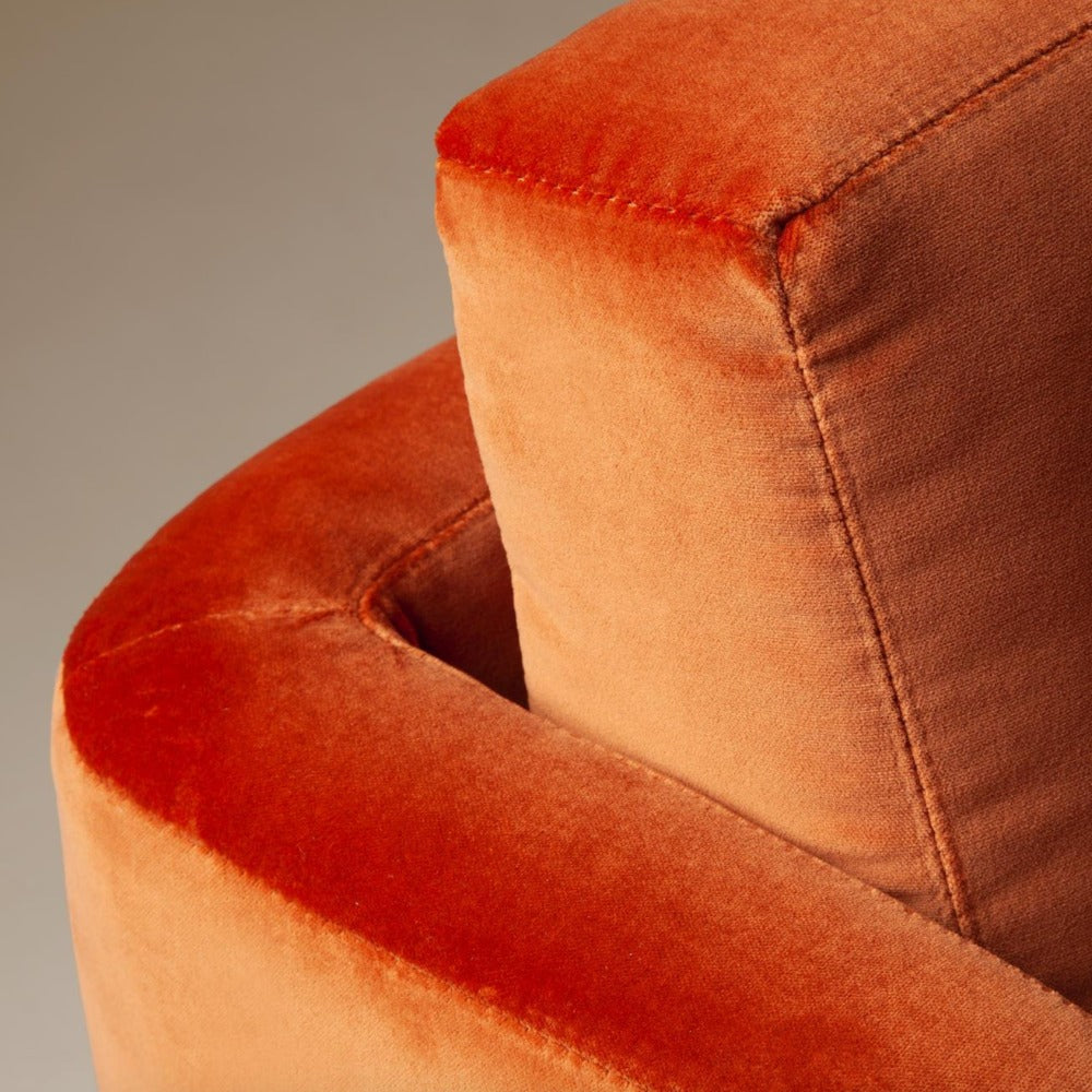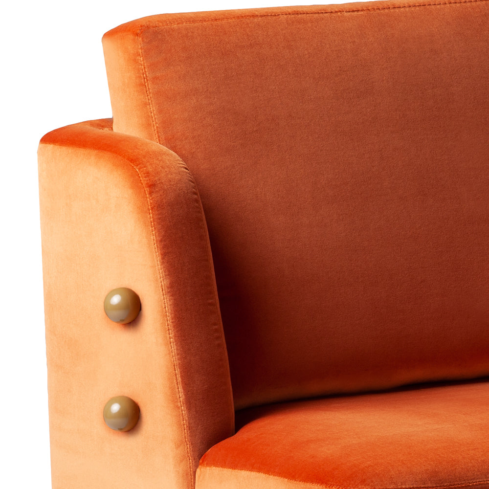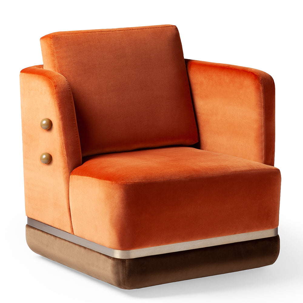 - First image: top upholstery and cushion in Velvet Terracotta; bottom upholstery in Velvet Woods; sphere applications in lacquered MDF mocha; metal applications in stainless steel plated polished brass
