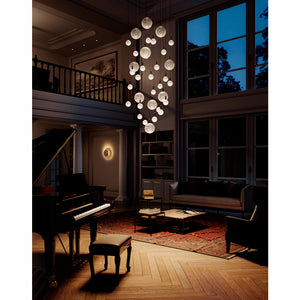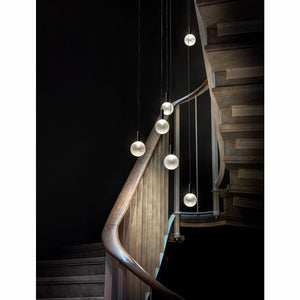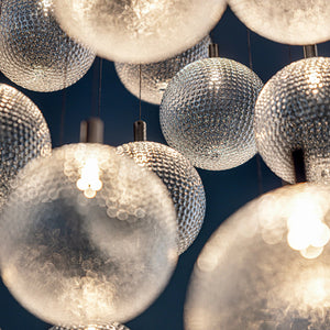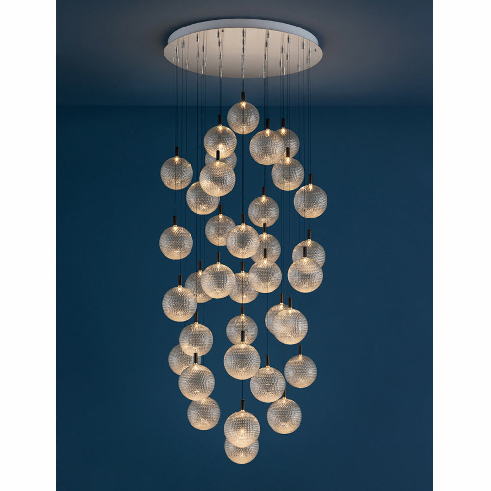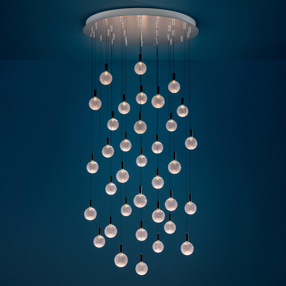 The Par 18 Chandelier is composed of 35 mouth-blown glass spheres with dimpled surfaces resembling golf balls. Thanks to the transparency of the glass and the thin cables that support the pendants, the Par 18 Chandelier stands out for the lightness and elegance of the entire composition as well as for the unique lighting effect. The Par 18 Chandelier comes in three set versions, each featuring 35 spheres in two different sizes (diameter 8 cm or 16 cm), but it can also be customised with different number of spheres as well as canopies in different sizes and finishes.