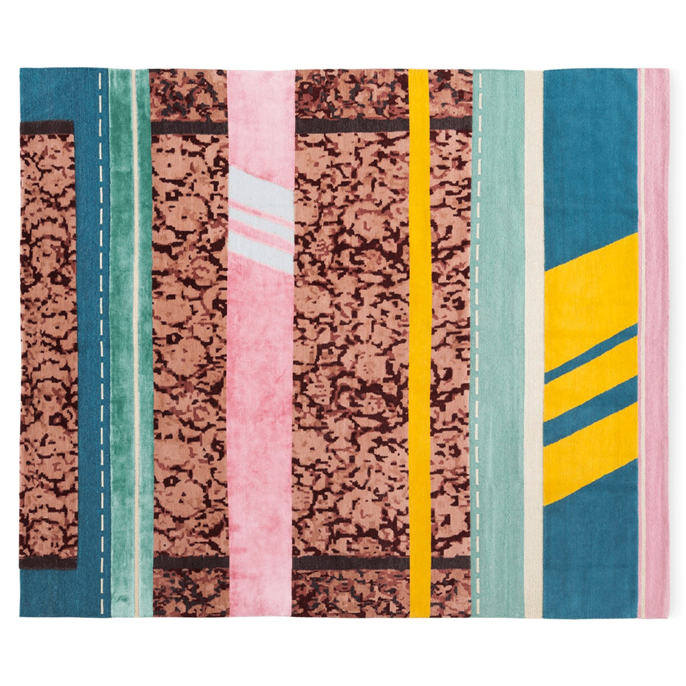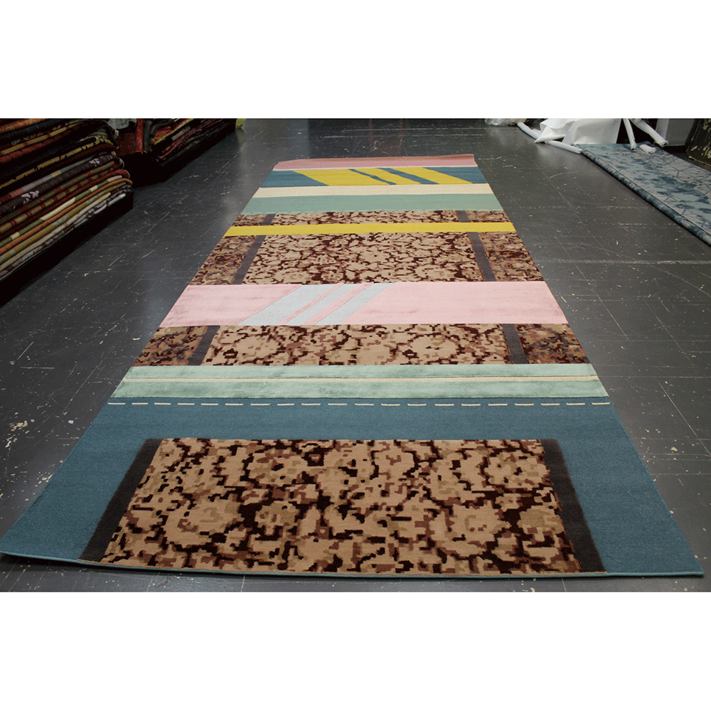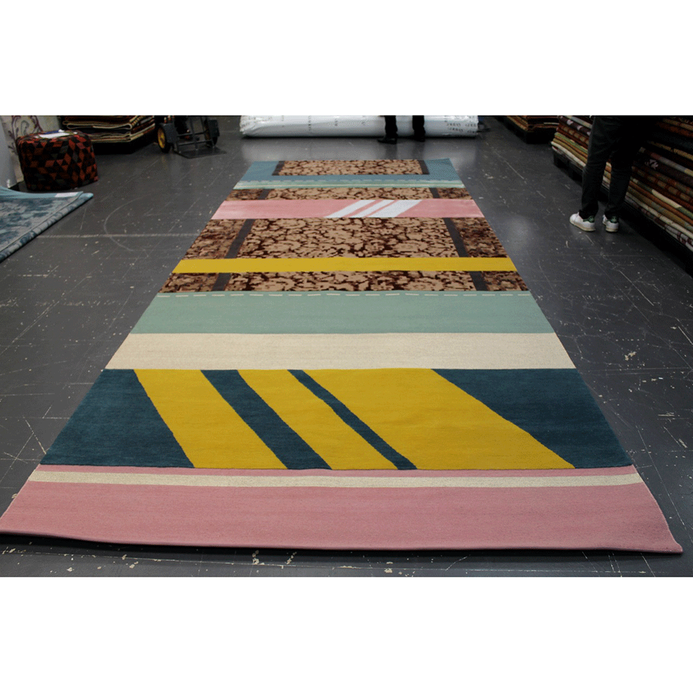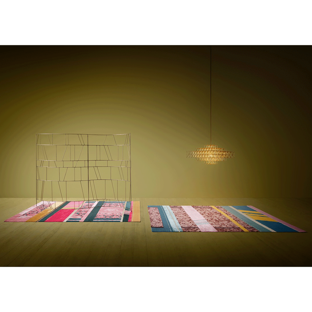 The Paralleli Rug stems from the art of combining together different materials, different eras and different styles. Baroque allusions of embroidery, edgings and frames are mixed with ornamental motifs and personalised revisitations of Persian and Indian patterns, creating harmonious contrast with the simplicity of exquisite monochrome and contemporary-art inserts. Geometric shapes and lines are otherwise references to Minimalism and American post-pictorial Abstractionism. The weave also features some metallic inserts: these thick, visible seams are stitched together to unite different textures and distant worlds and times.