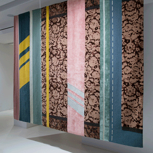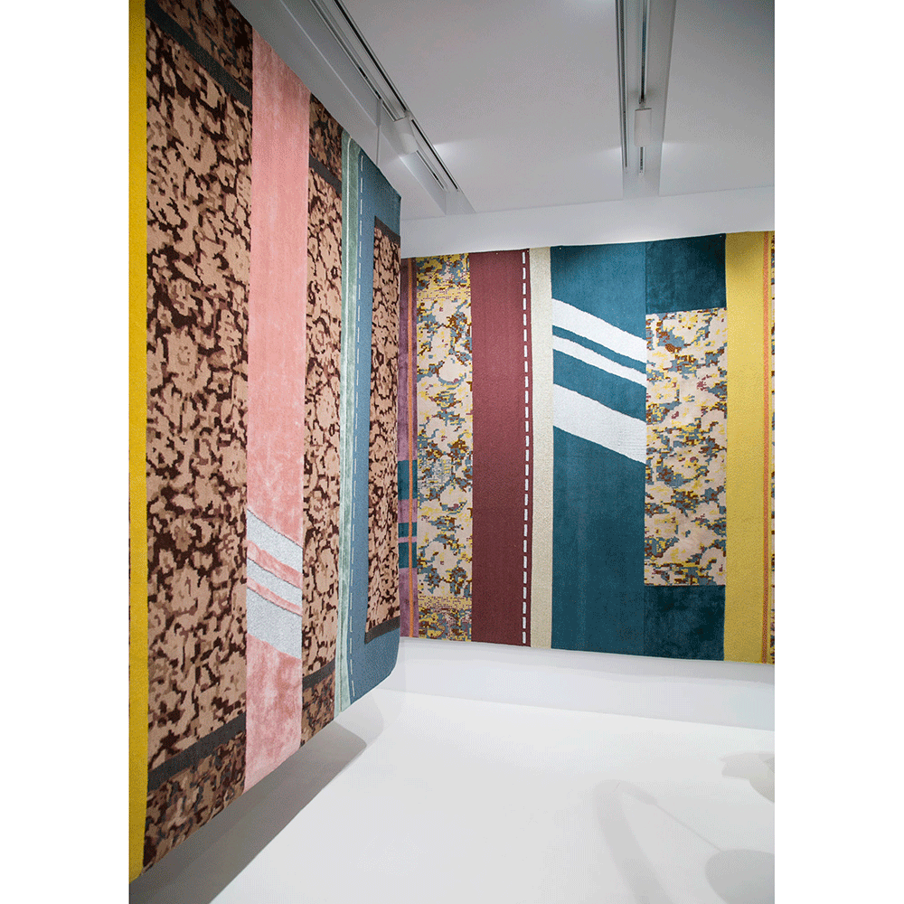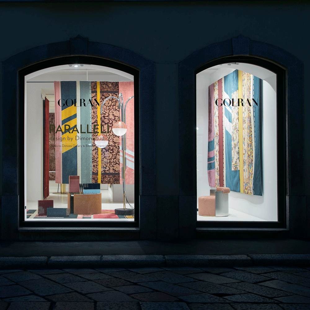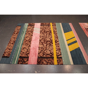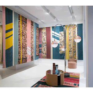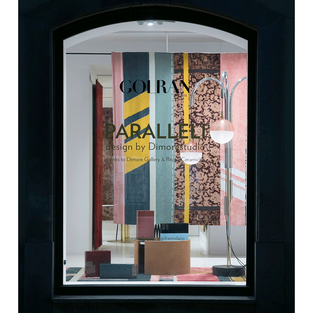 The Paralleli Rug stems from the art of combining together different materials, different eras and different styles. Baroque allusions of embroidery, edgings and frames are mixed with ornamental motifs and personalised revisitations of Persian and Indian patterns, creating harmonious contrast with the simplicity of exquisite monochrome and contemporary-art inserts. Geometric shapes and lines are otherwise references to Minimalism and American post-pictorial Abstractionism. The weave also features some metallic inserts: these thick, visible seams are stitched together to unite different textures and distant worlds and times.