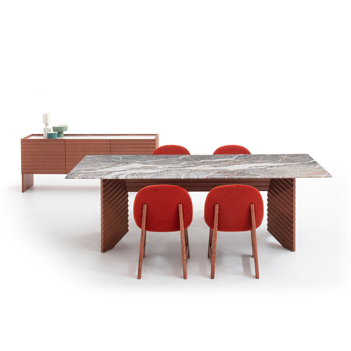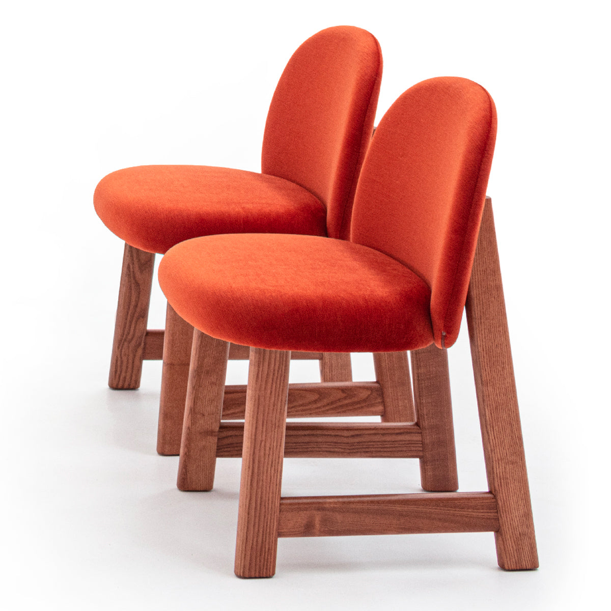 The design of the Pheaby chair is an elegant balance between artisanal and industrial elements, with the softly rounded seat and backrest supported by solid wood legs which resemble a carpenter's trestles. Pheaby is a very comfortable dining chair which works well in classic and contemporary design schemes, both at home and in public spaces.