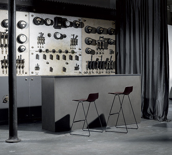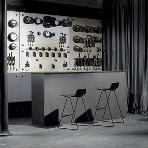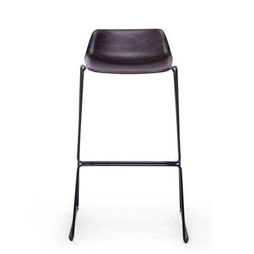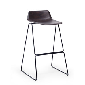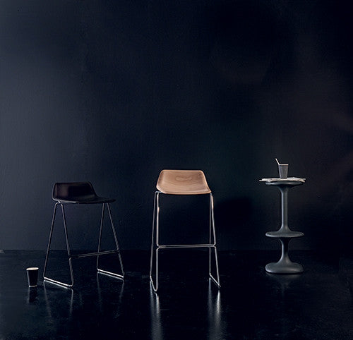 The plywood seat of the Pressious Bar Stool is sculpted using 3D technology to create a streamlined, naturalistic shape which combines comfort with style. The "sleigh" base of the stool is made of thin looped metal rods, creating a slim profile in perfect harmony with the seat.