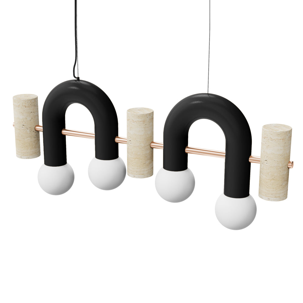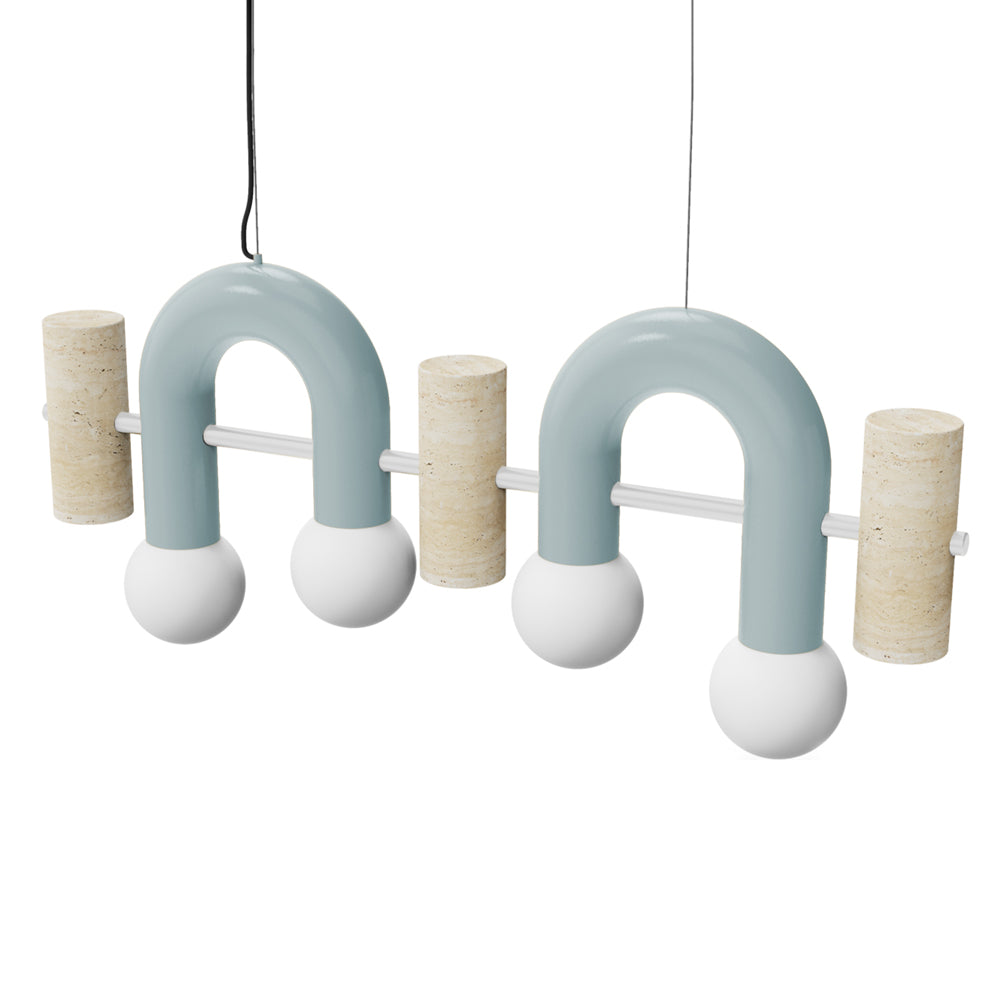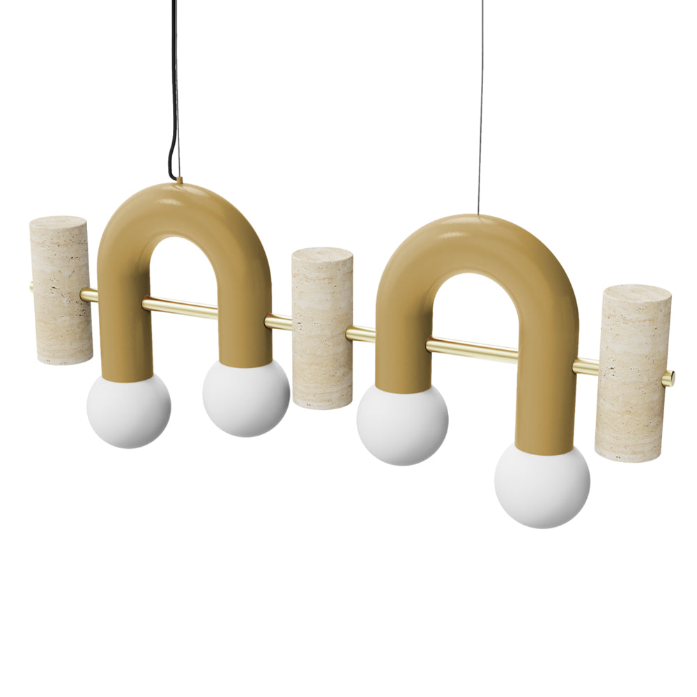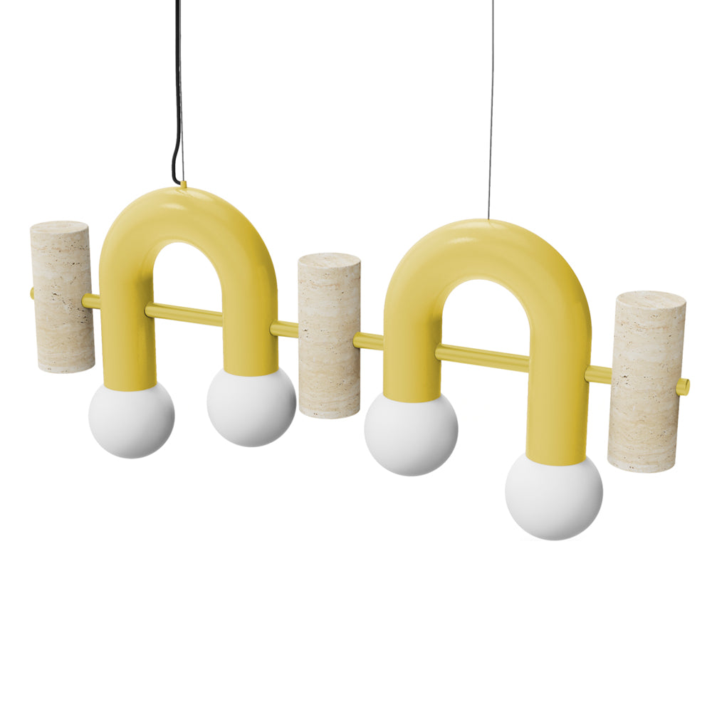 Pyppe Flat - Suspension Light is a colourful, playful and sculptural suspension light featuring a metal structure with metal round holders for the bulbs and travertine marble finishes.