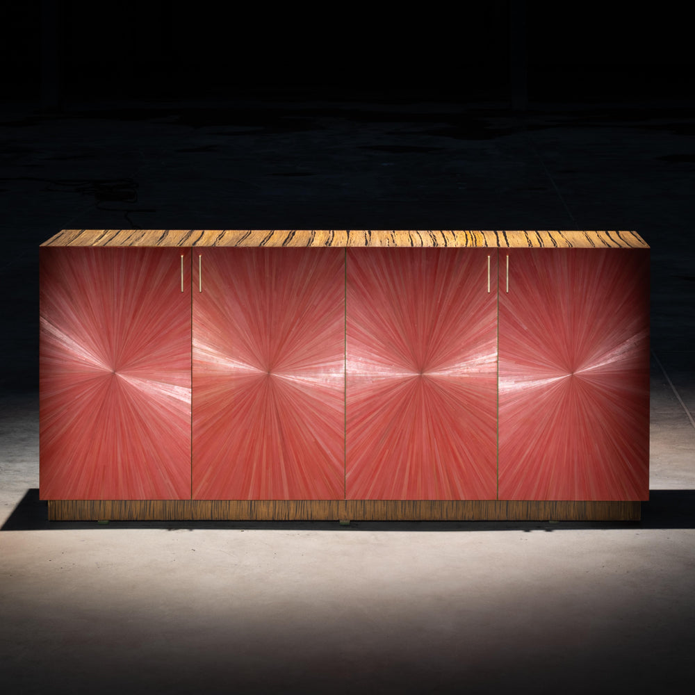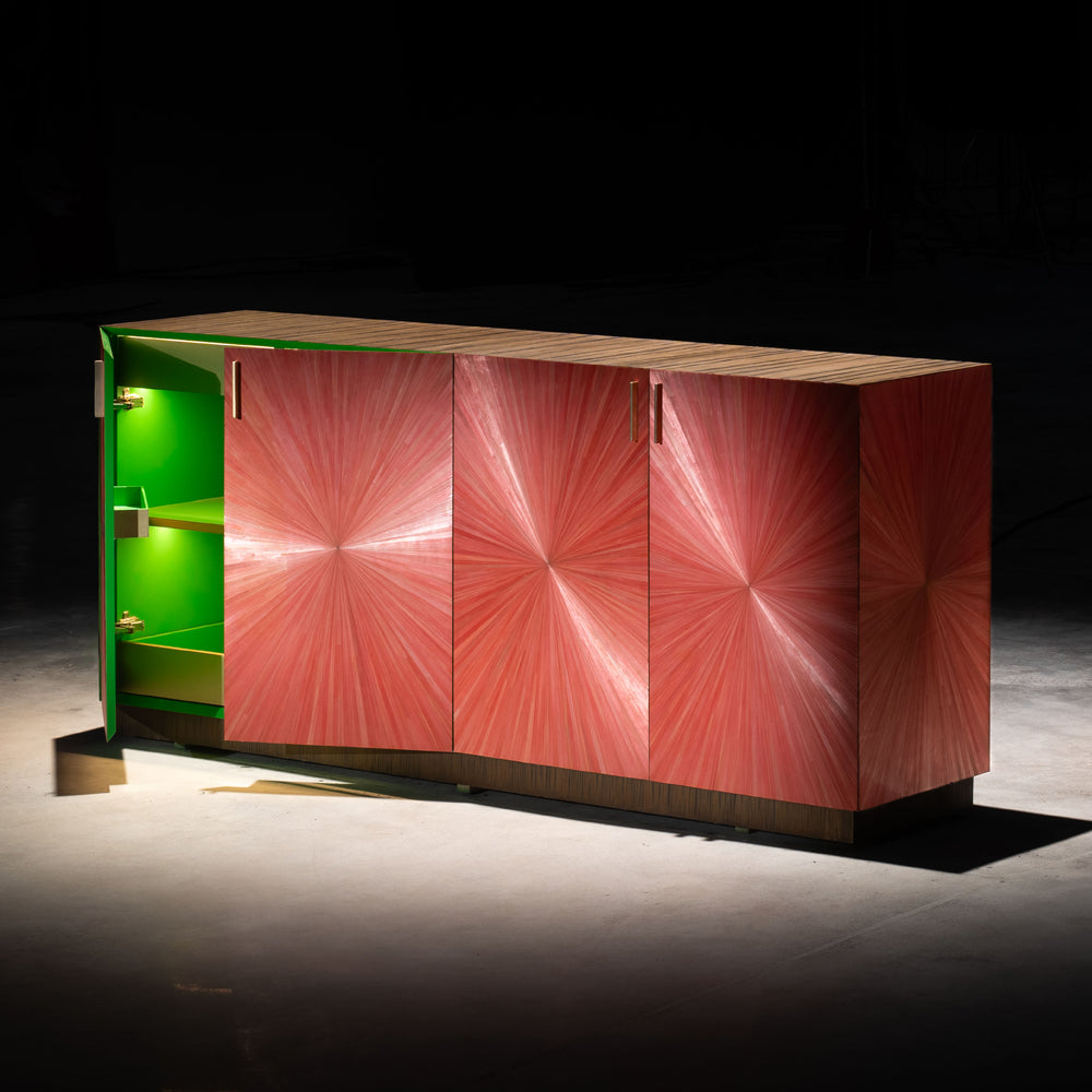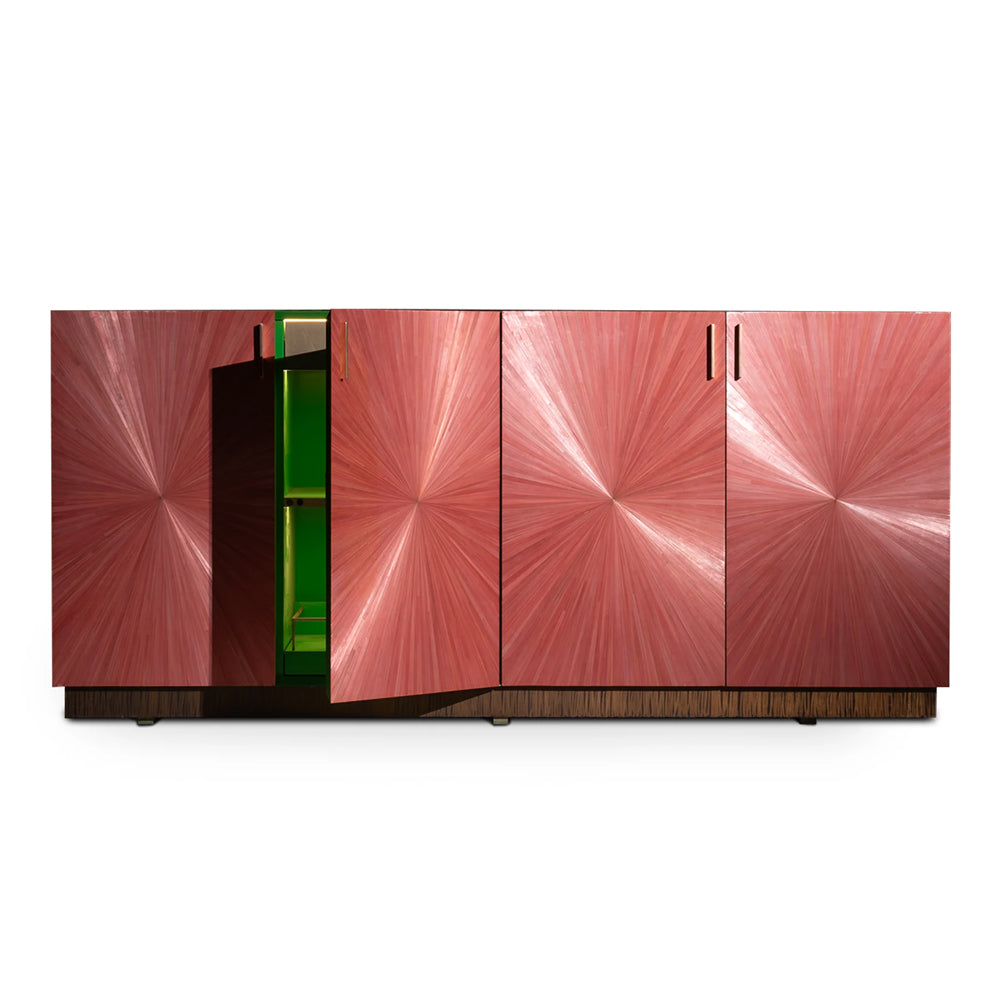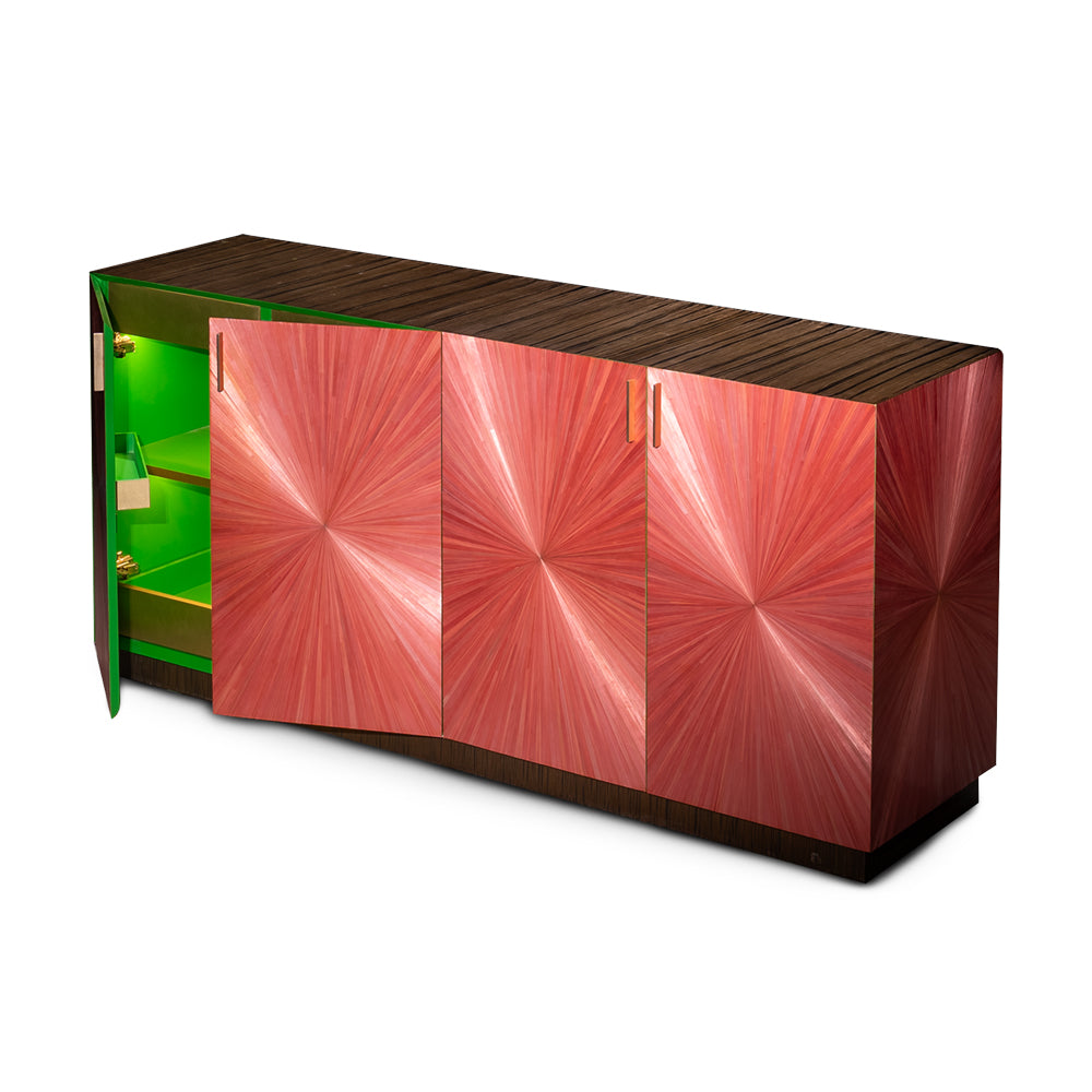 Radiance Coral Credenza - Made To Order is a generous and luxurious cabinet which exudes the beauty of straw marquetry, boasting a coral outer finish and pop of green inside. Radiance includes lush brass trimmings and a stunning brass top.