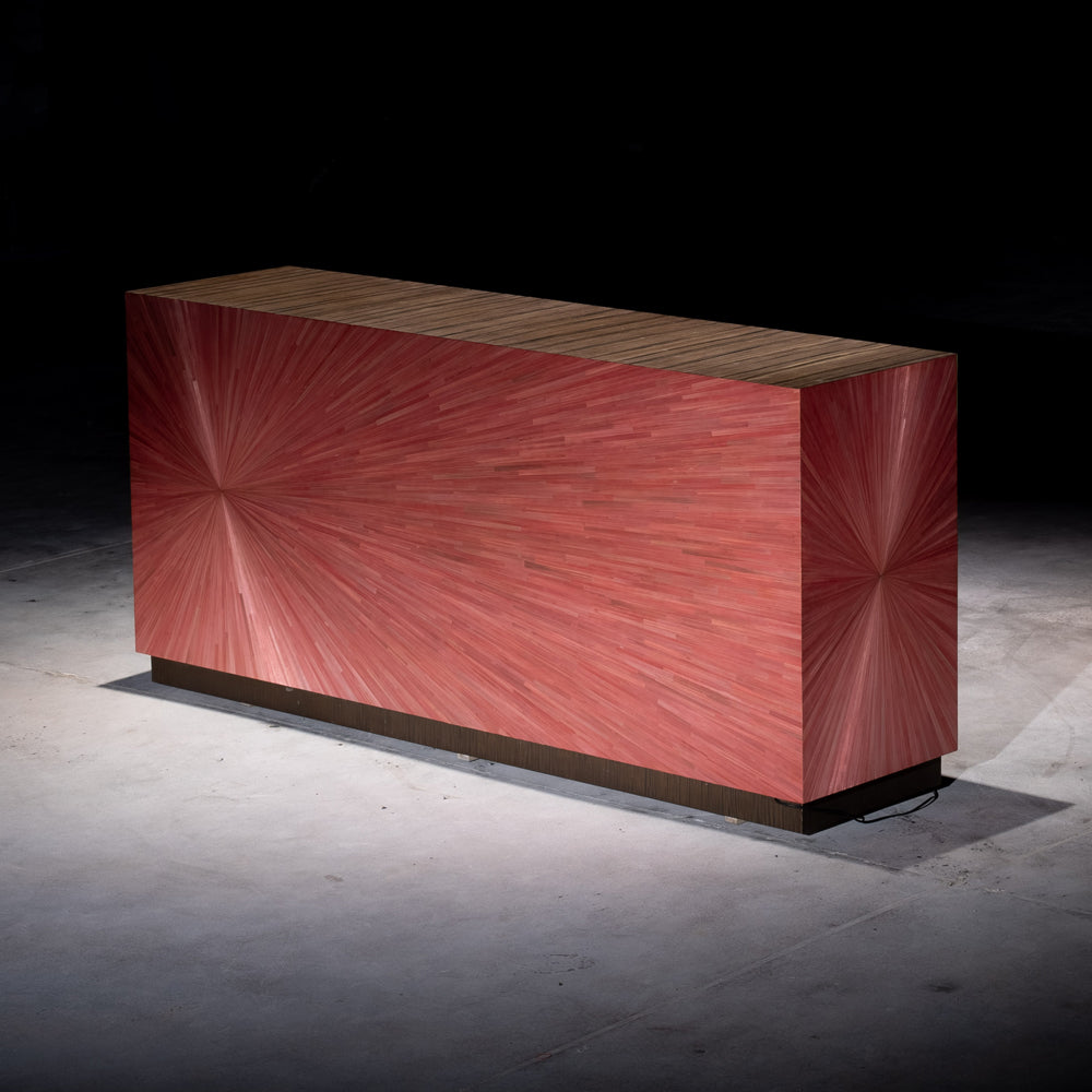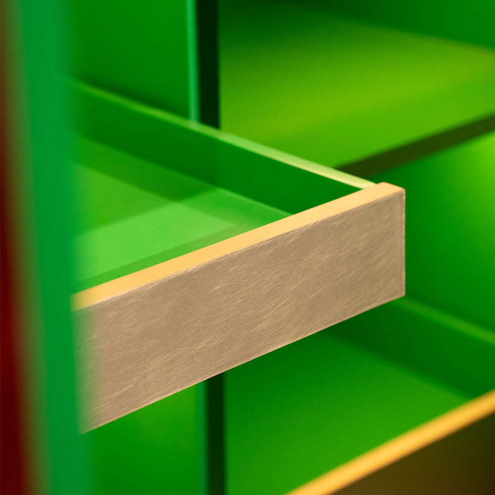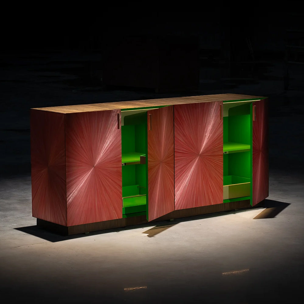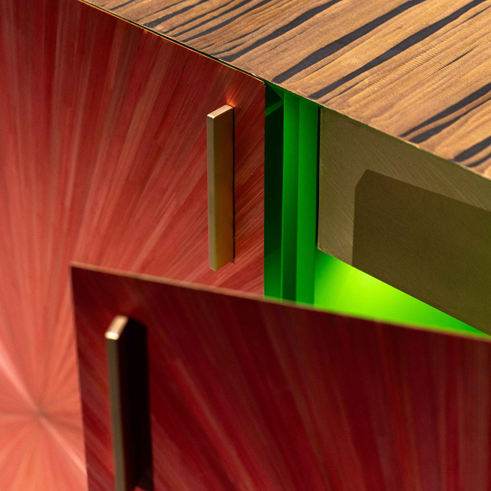 Radiance Coral Credenza - Made To Order is a generous and luxurious cabinet which exudes the beauty of straw marquetry, boasting a coral outer finish and pop of green inside. Radiance includes lush brass trimmings and a stunning brass top.