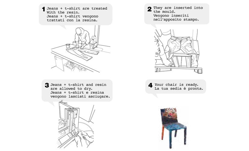 - The chair can be customised with jeans and cotton t-shirts supplied by the customer