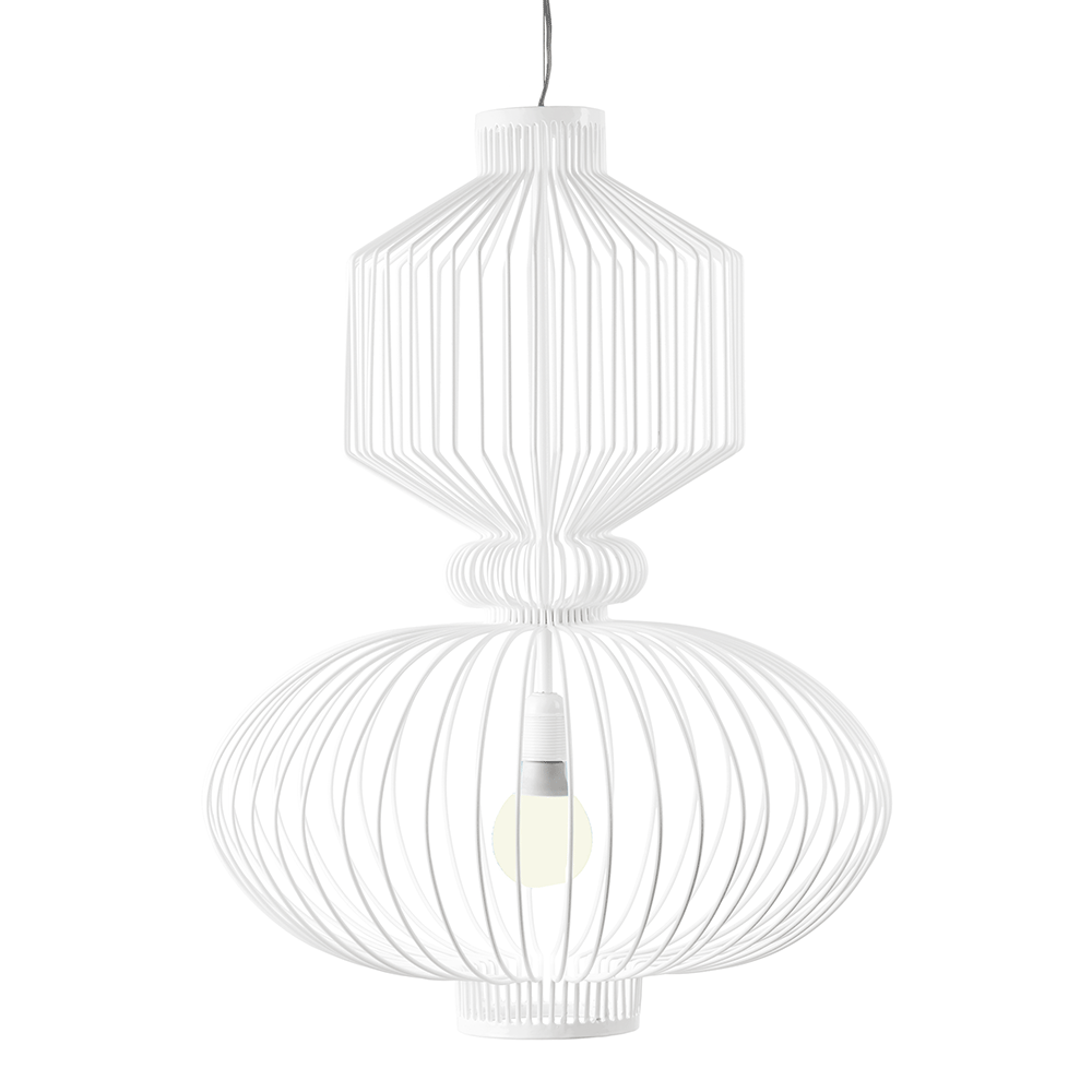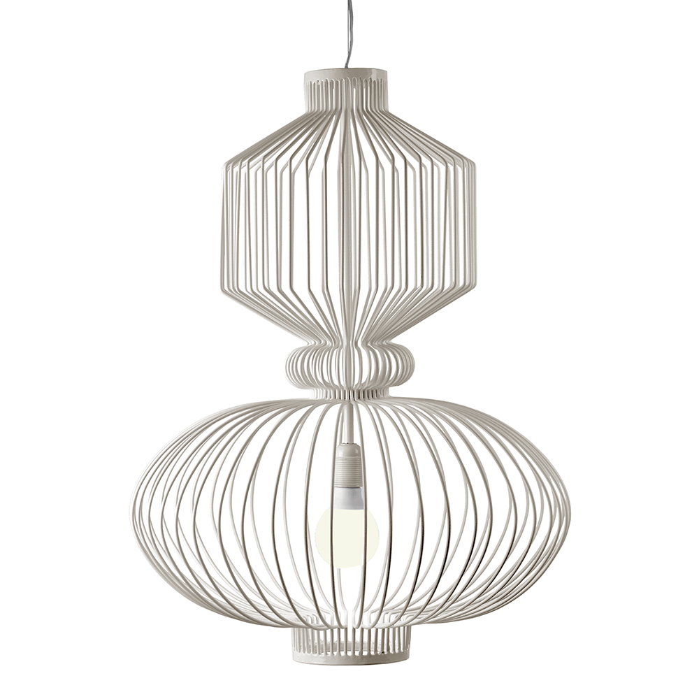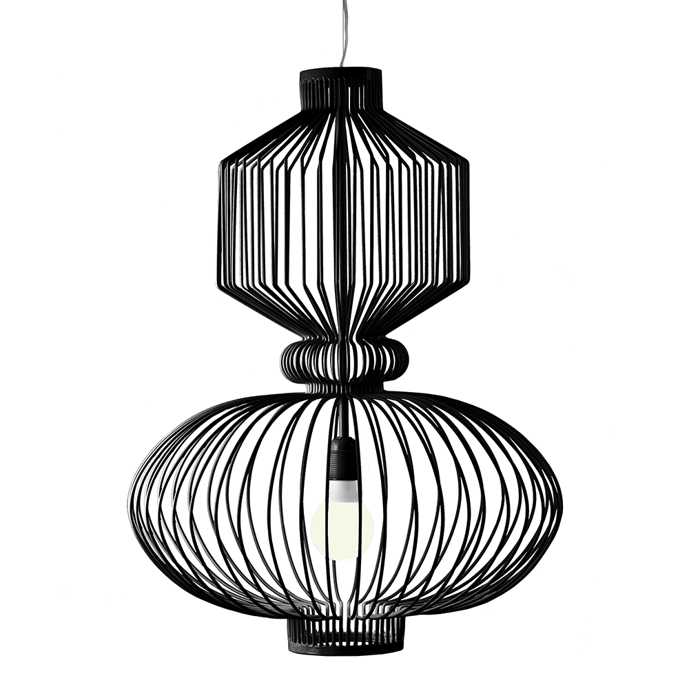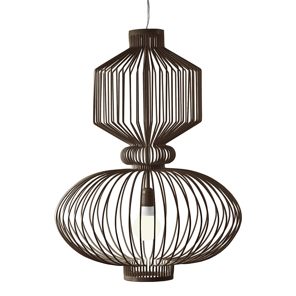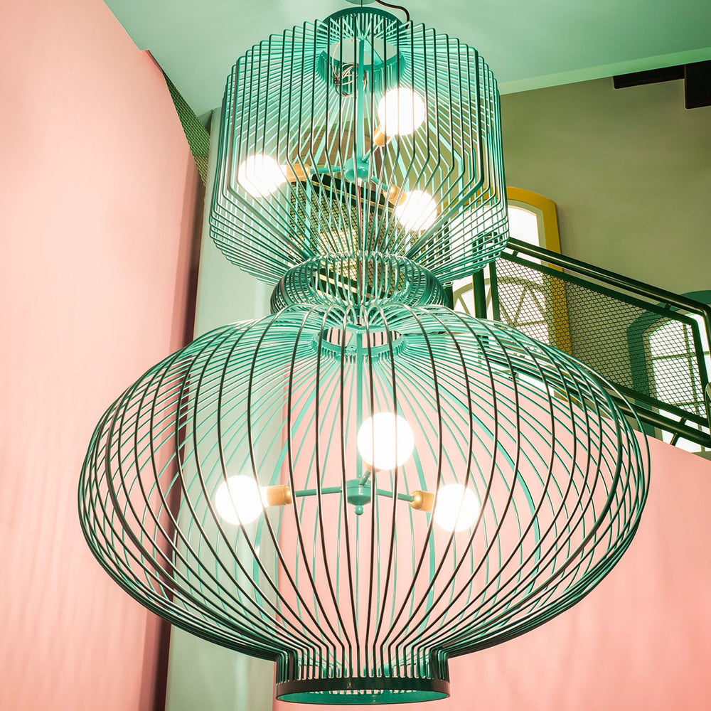Revolution - Suspension Light is a sculptural and impactful suspension light featuring a distinctive structure made with metal rods which look like cages stacked on top of each other.