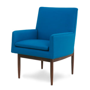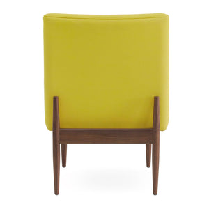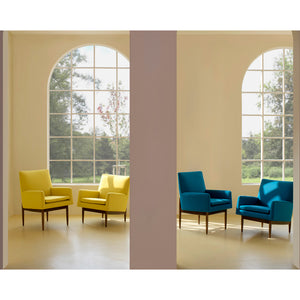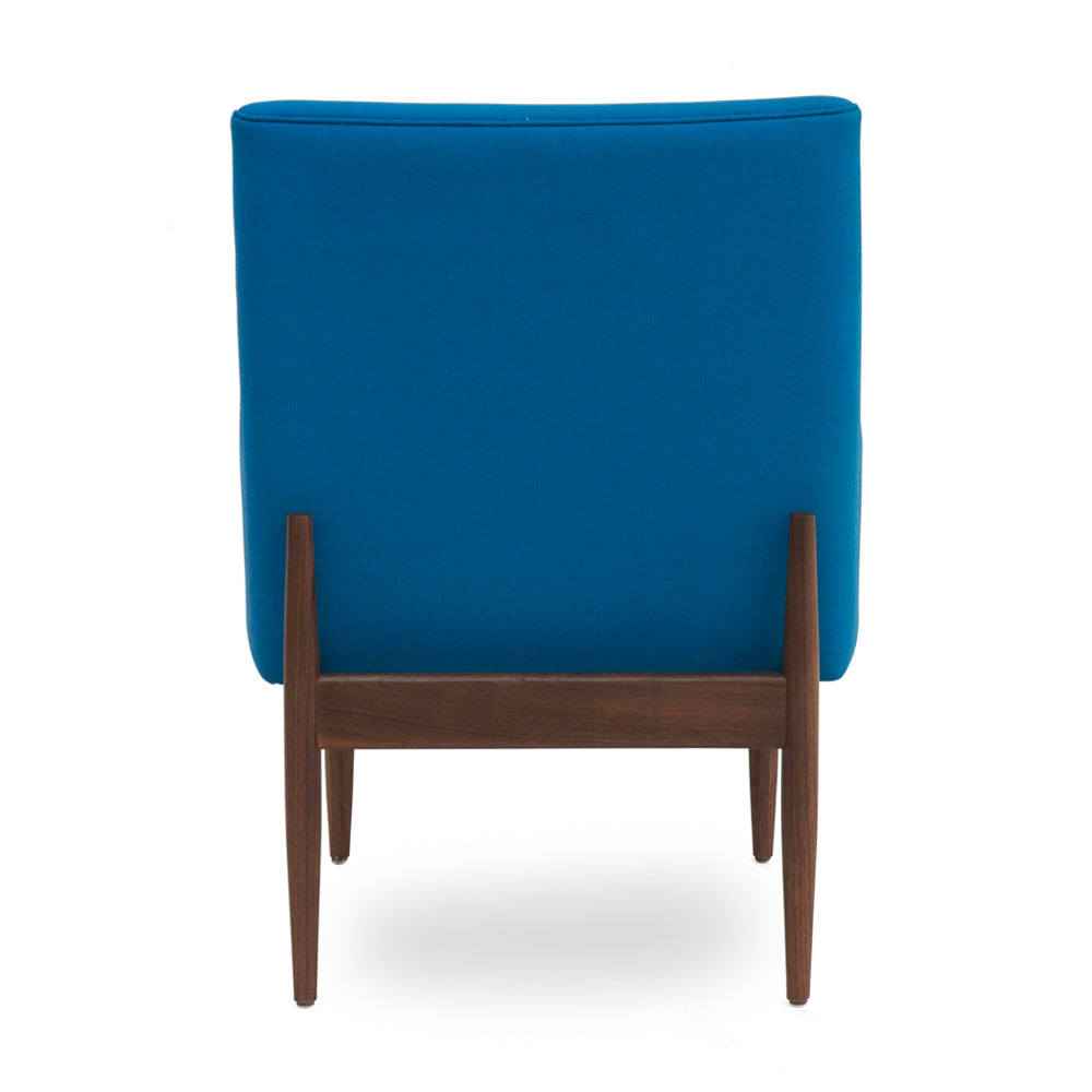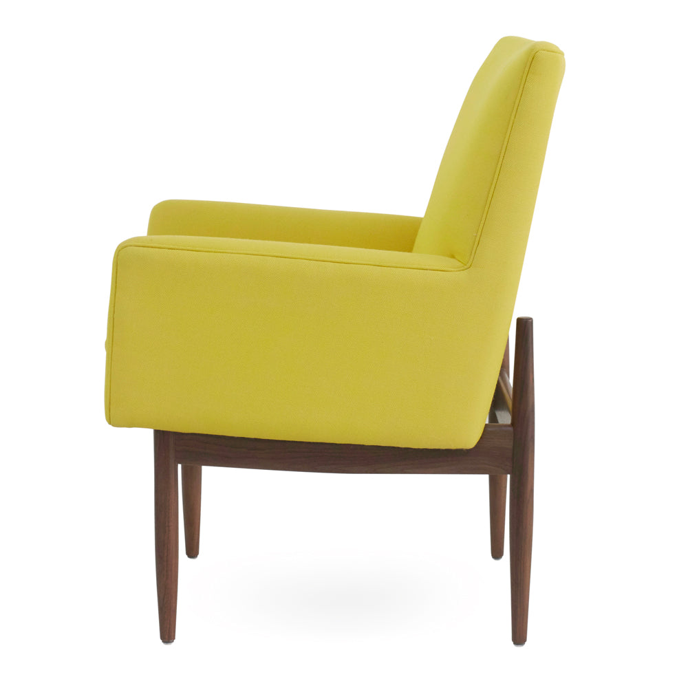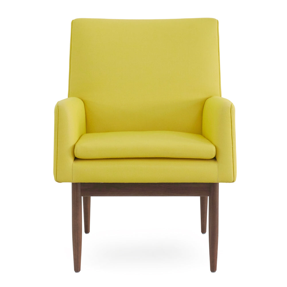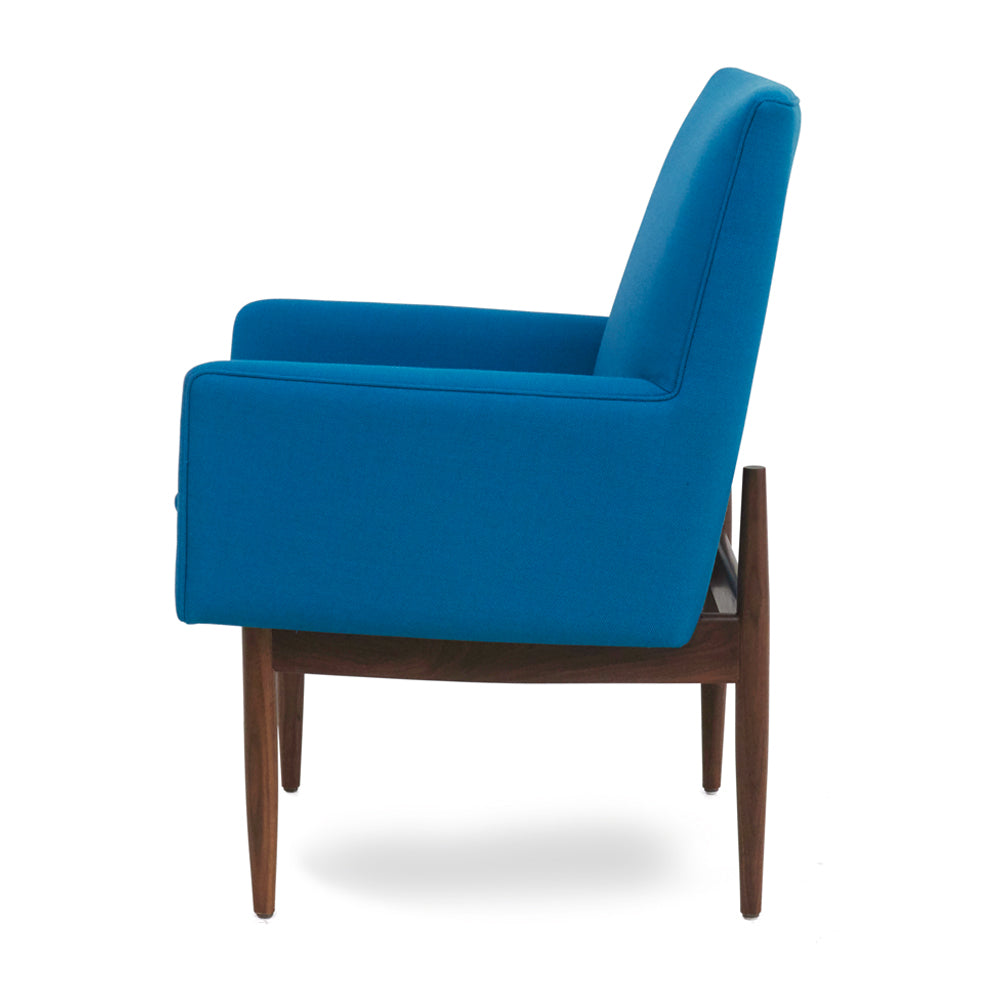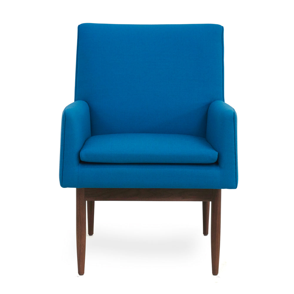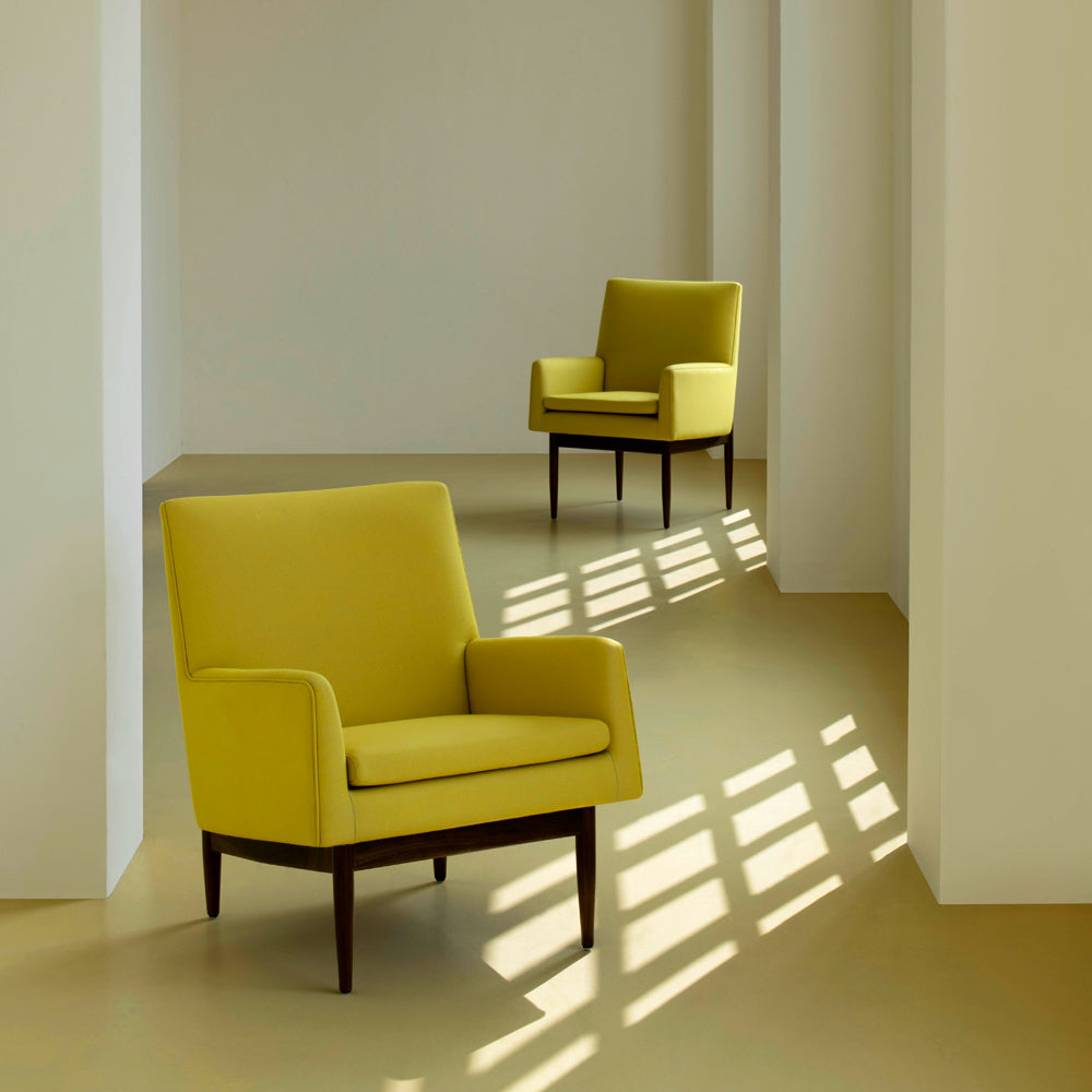 The Risom C180 Armchair (1955) has a classic and timeless good look and feel, instantly recognisable by its steady legs and its comfortable fully upholstered seat and backrest and solid wood base. This generously proportioned armchair has a robust solid wood frame and a stylishly angled seat back. The cane back version of the chair was used in the White House in the 1960s, with President Lyndon B. Johnson photographed sitting on it whilst he signed the Civil Rights Act in 1964.