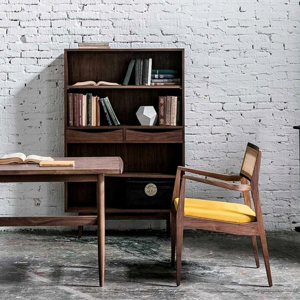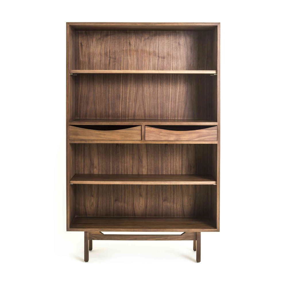 The Risom Shelves (1955) is a freestanding shelving unit with a timeless distinctive mid-century style focusing on simplicity and functionality and marking it out as a true modern classic. This compact bookcase combines 4 open shelves with two drawer compartments, the latter featuring cut-out drawer fronts, which gives the bookcase a sense of lightness. A cane back version of the chair of this same collection was used in the White House in the 1960s, with President Lyndon B. Johnson photographed sitting on it whilst he signed the Civil Rights Act in 1964. The Risom Shelves comes with a solid oak or walnut wood structure in various finishes with veneer panels.