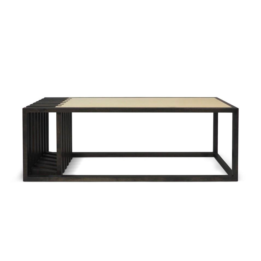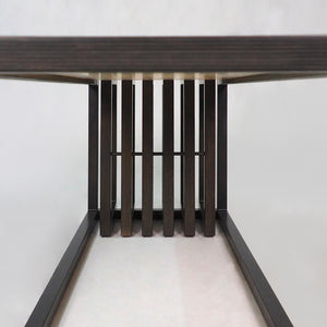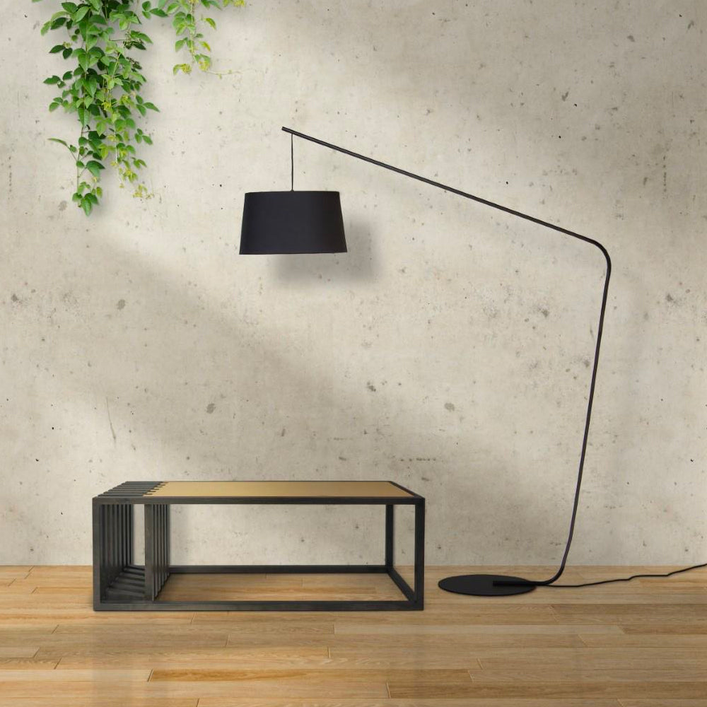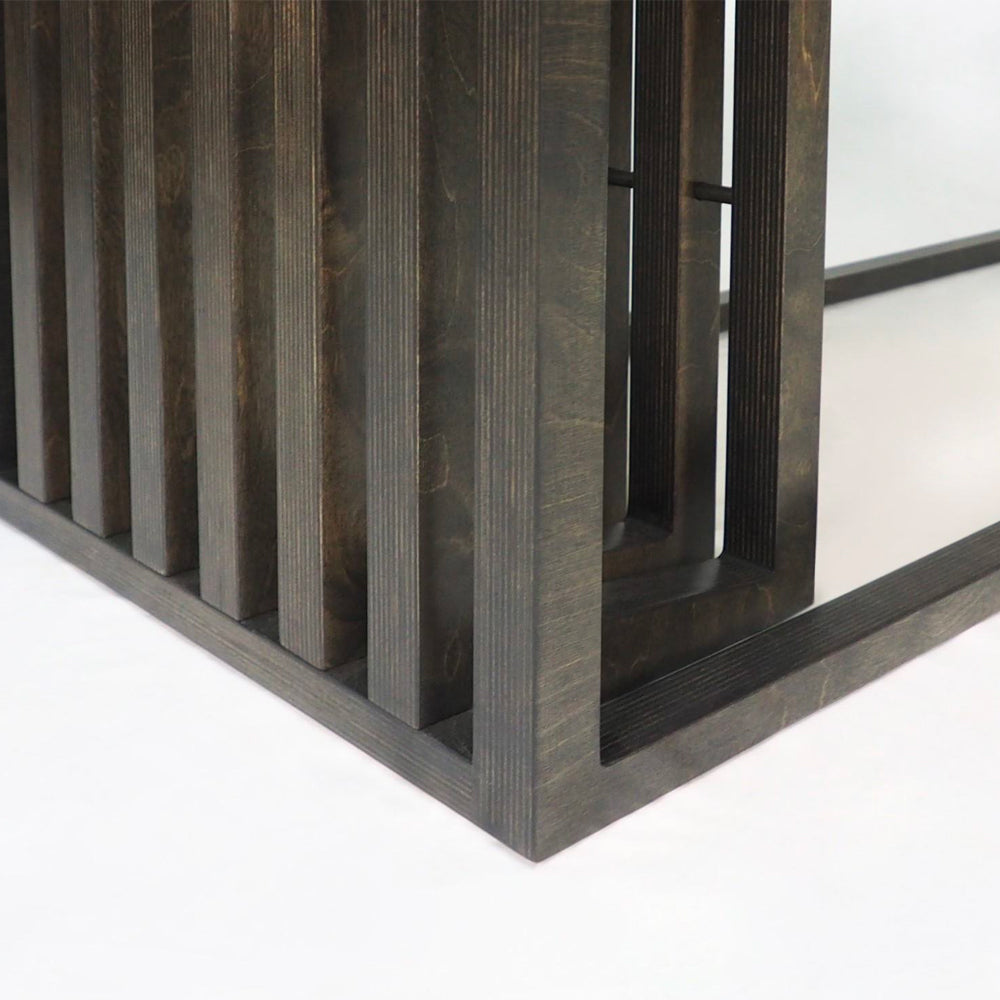 Structure: birch plywood, with a combination of natural and dark grey tainted, matte finishes; black metal feet