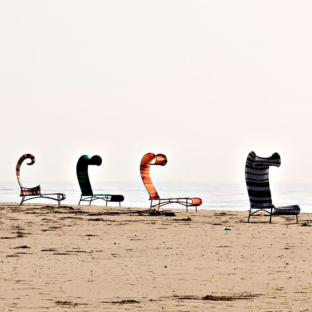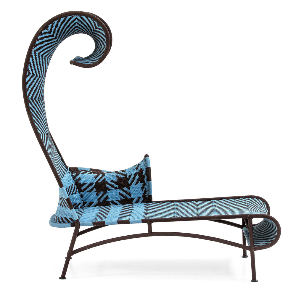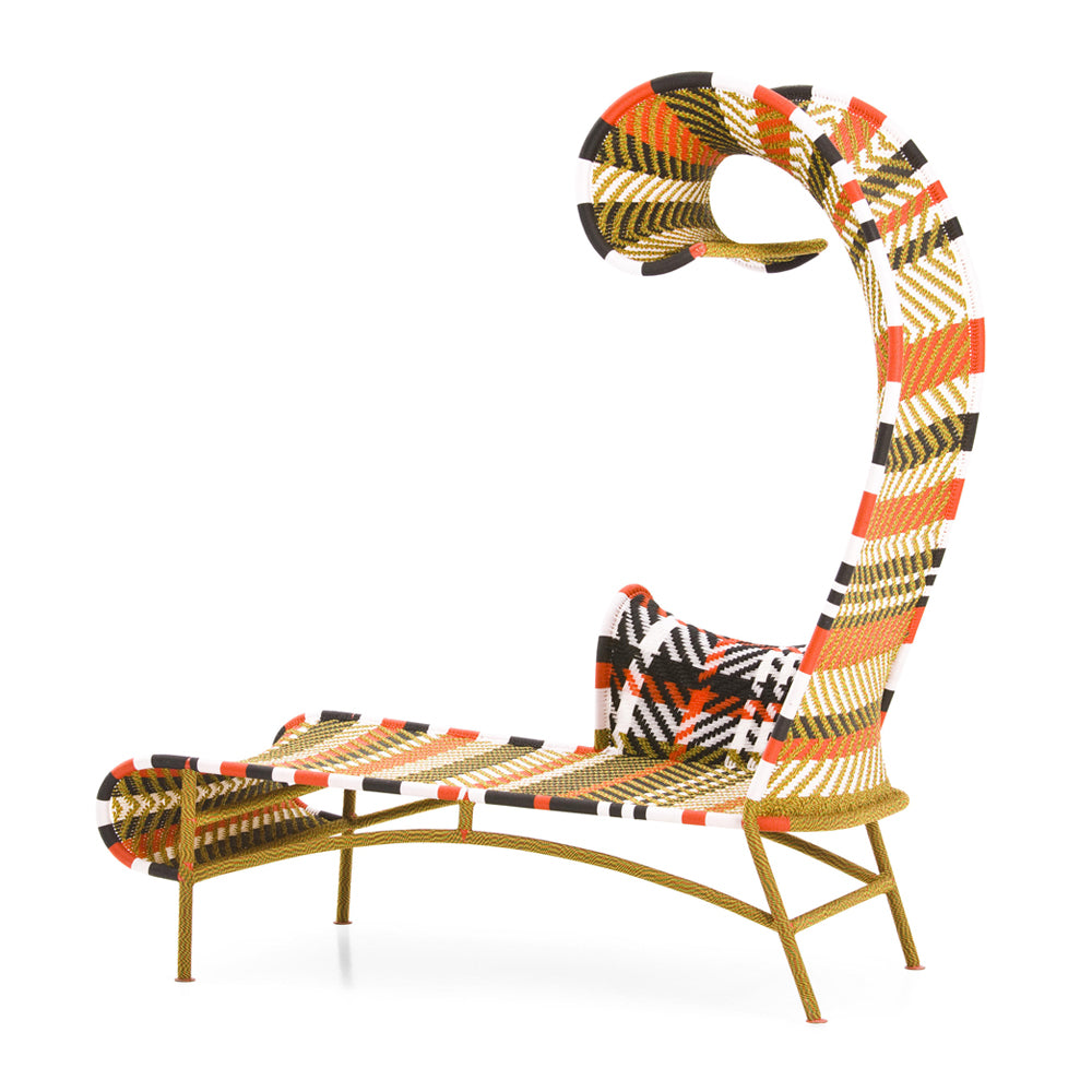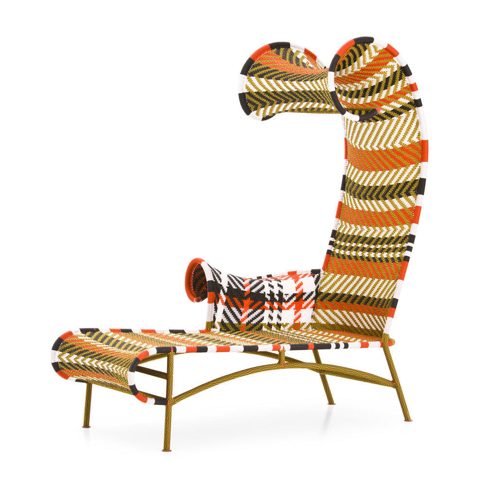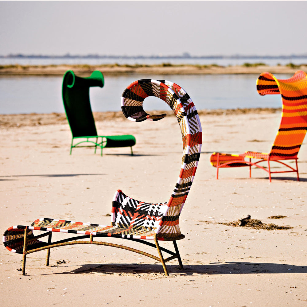 The Shadowy Chaise Longue is hand-crafted using woven threads normally used for fishing nets. The designs are all different and original, human in their imperfections and flaws. The Shadowy Chaise Longue is perfect for injecting a dose of colour and fun in the garden, patio or terrace. It is available in left arm and right arm versions (left or right as seen facing the front of the chaise longue).