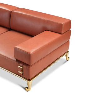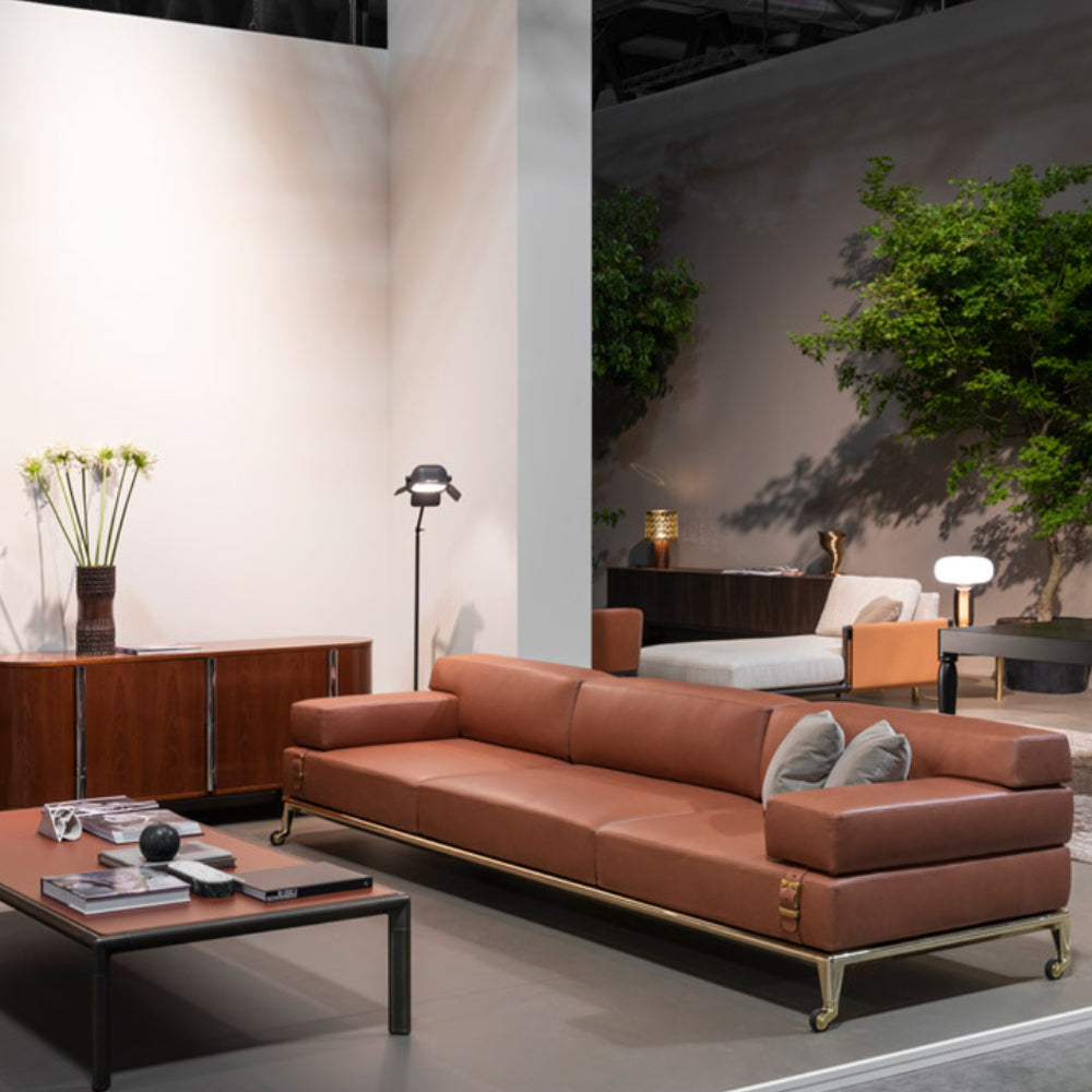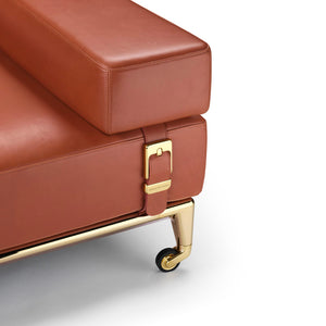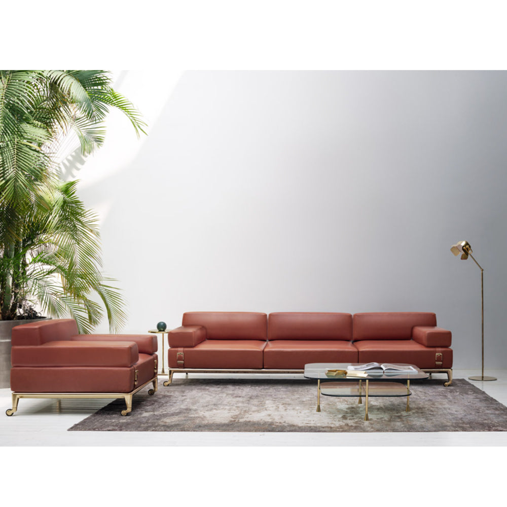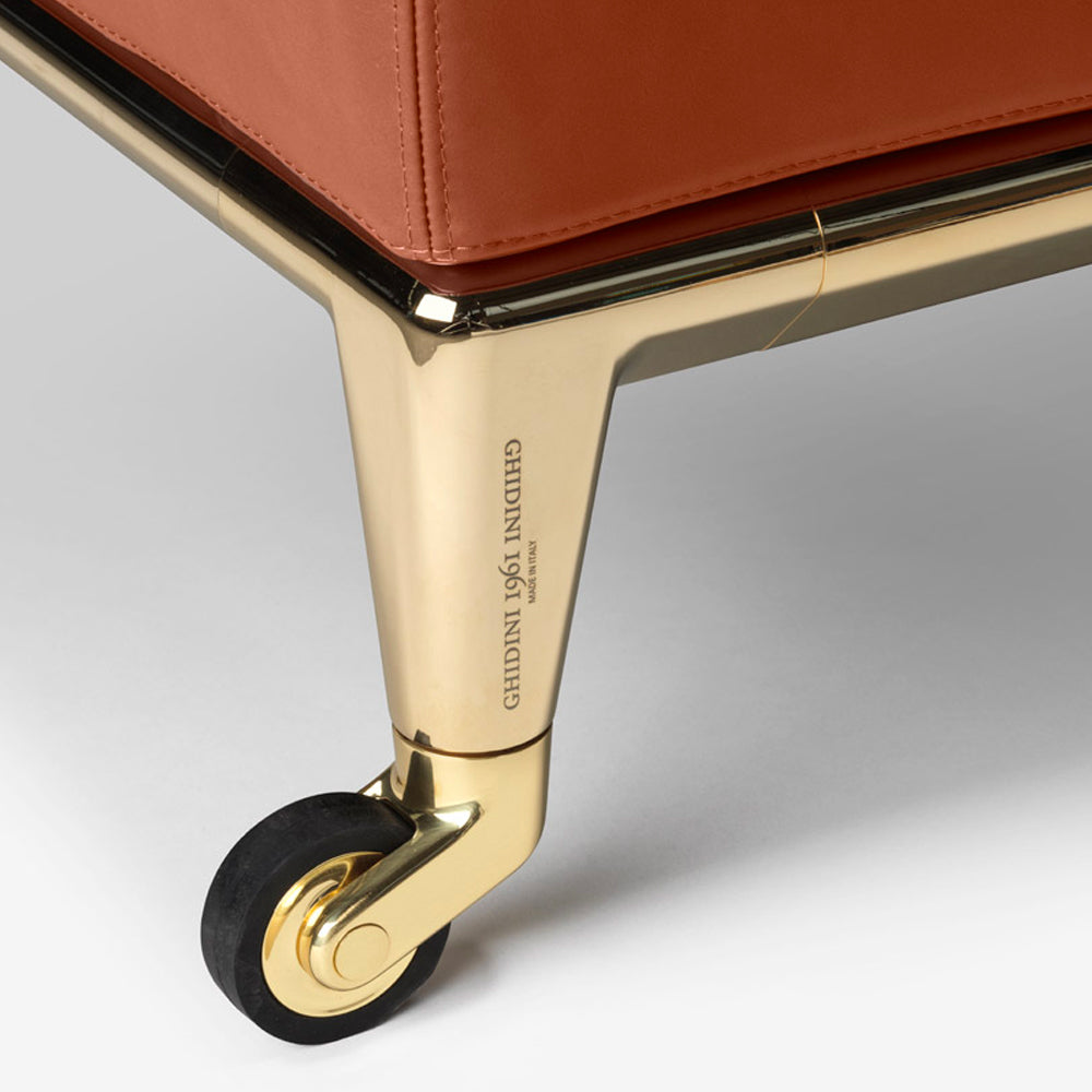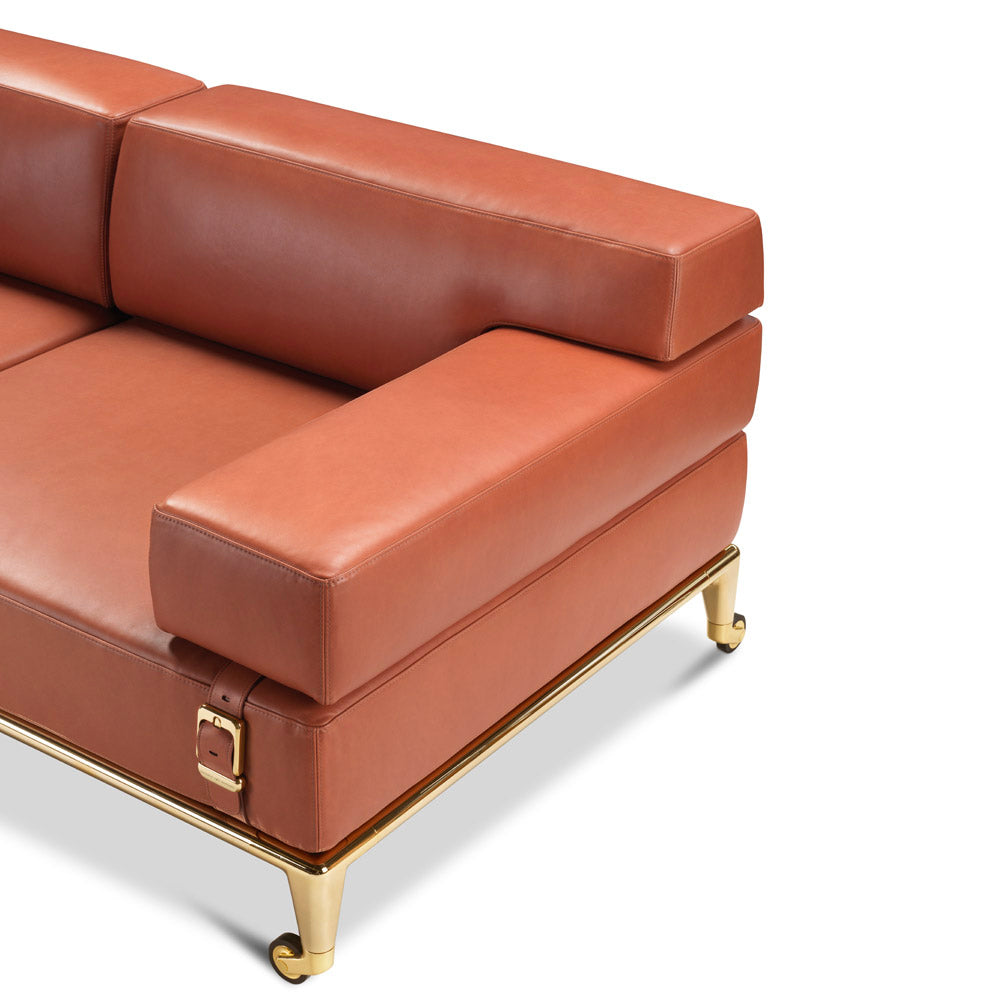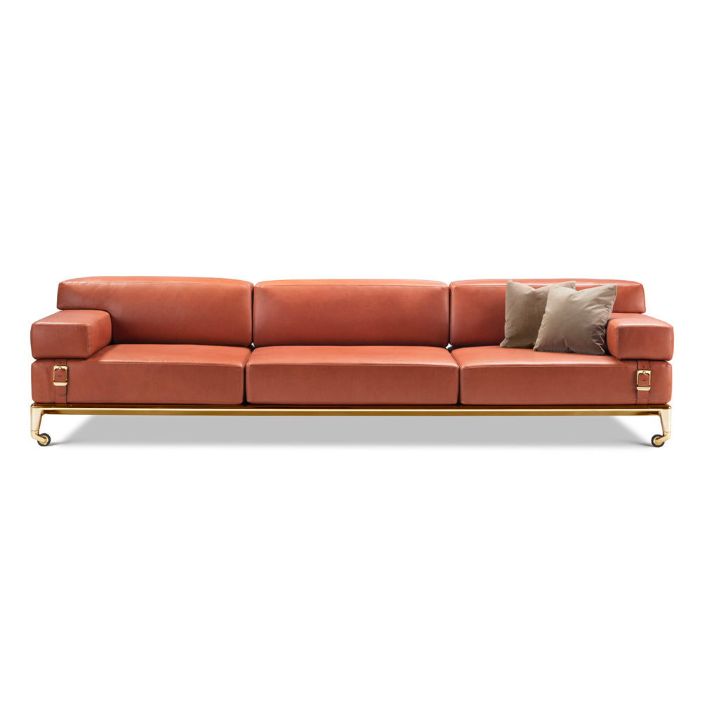 The Shaker Sofa brings back memories of sophisticated elegance. The rigorous layout of the cushions and the backrest are combined with precious metal elements which give this sofa its strong identity. Shaker features an elegant strap which holds the armrests; its feet are die-cast thanks to the quality of the craftsmanship of Ghidini 1961's master craftsmen and its slick wheels offer further sense of lightness and old fashion elegance. The Shaker sofa offers luxurious comfort.