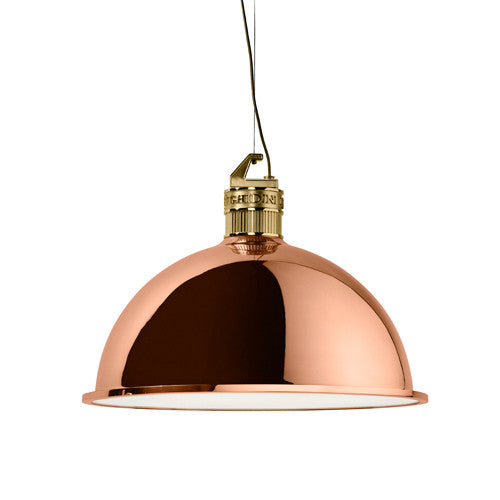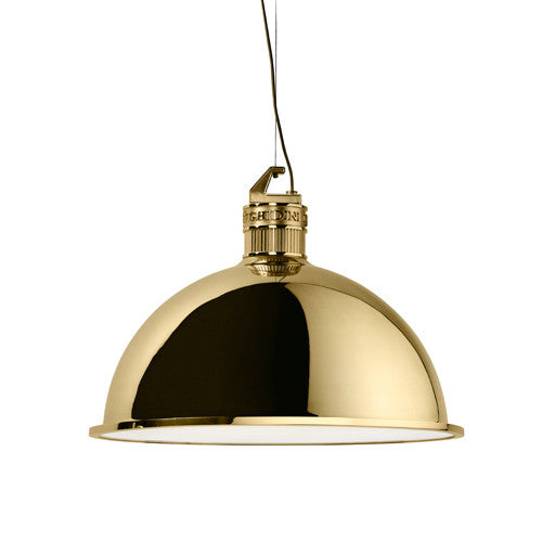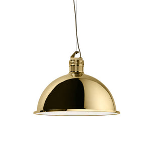 The Special Factory Suspension Light is inspired by industrial style bell-shaped metal lamps used in factories. The smooth and reflective bell is made of brass, with its characteristic sheen and weight. Other distinguishing features include the lip at the edge of the bell, the casting that encloses the bulb holder, the anchor hook and the poly-carbonate diffuser that closes the bell (thereby concealing the light bulb) and creates a warm glow.
