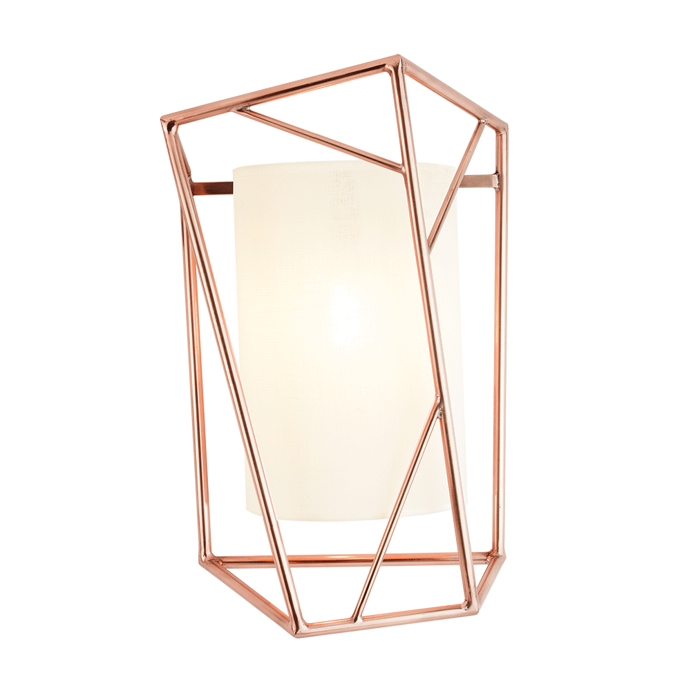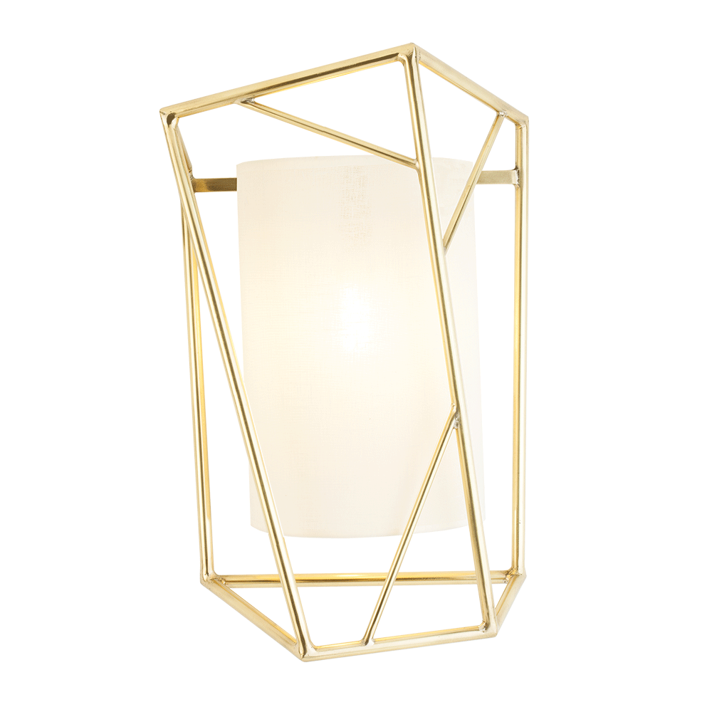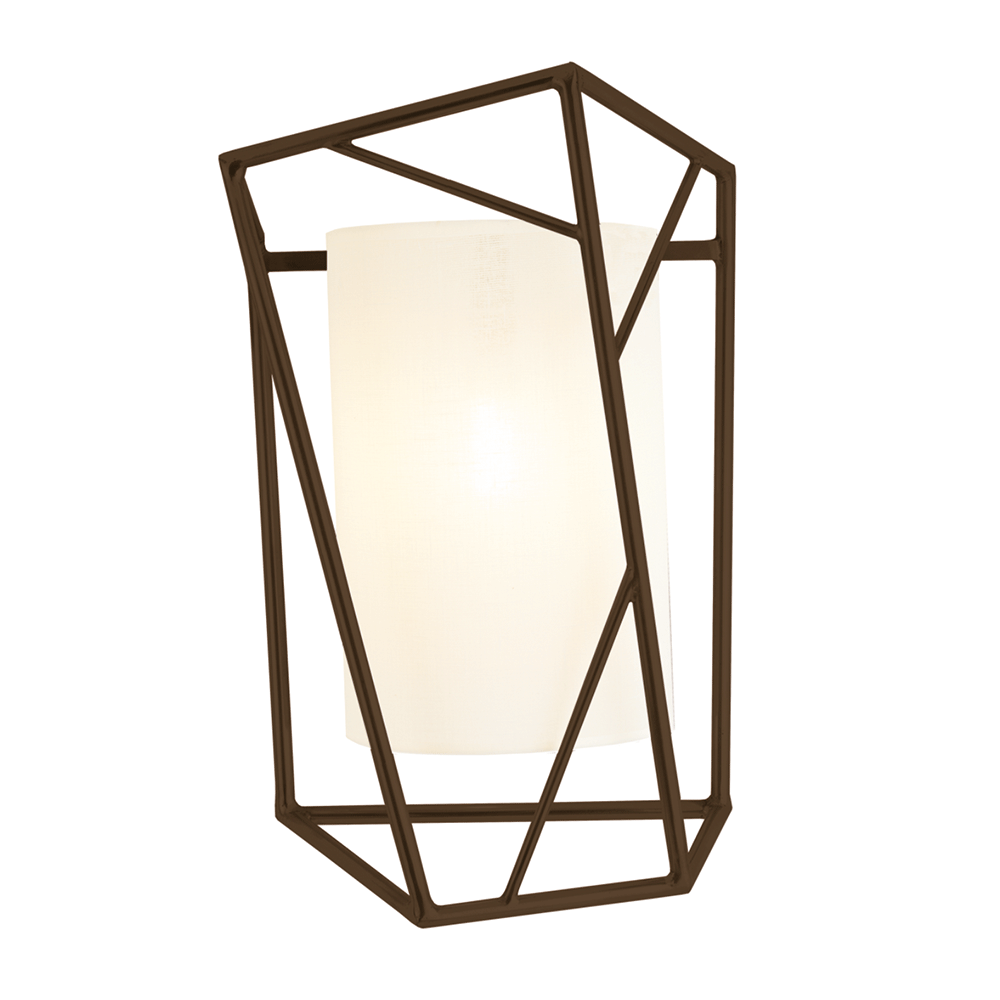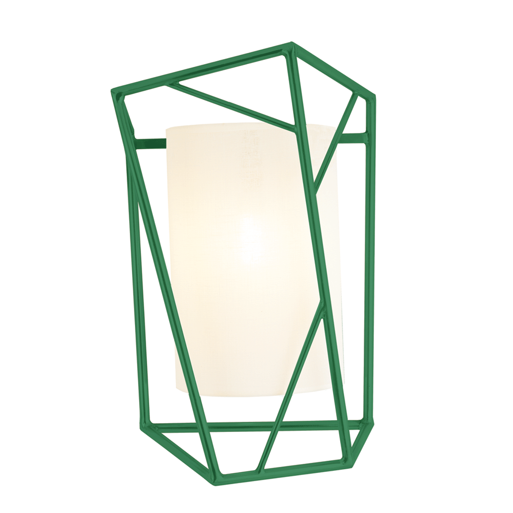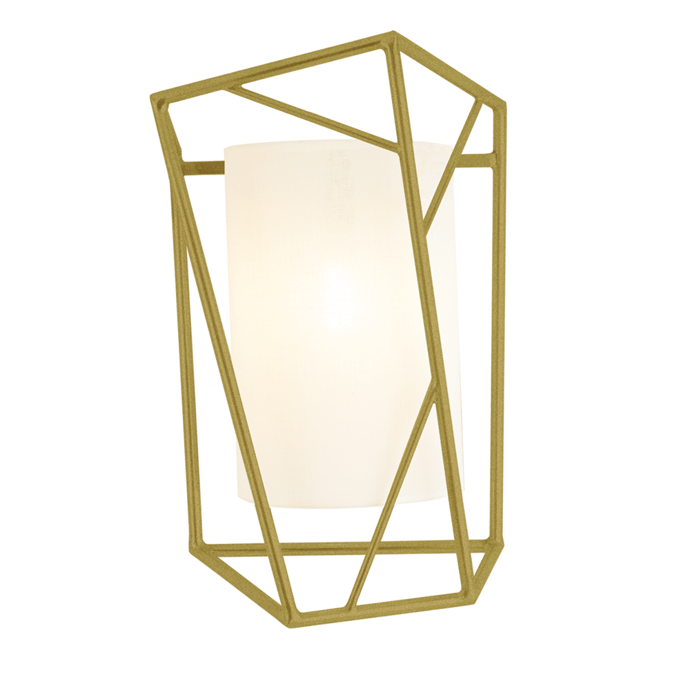 Star - Wall Light is an elegant and sculptural wall light featuring a drum-shaped cotton lampshade encased within a cage-like structure made of metal rods, highlighting the contrasts between hard and soft textures as well as regular and random shapes.