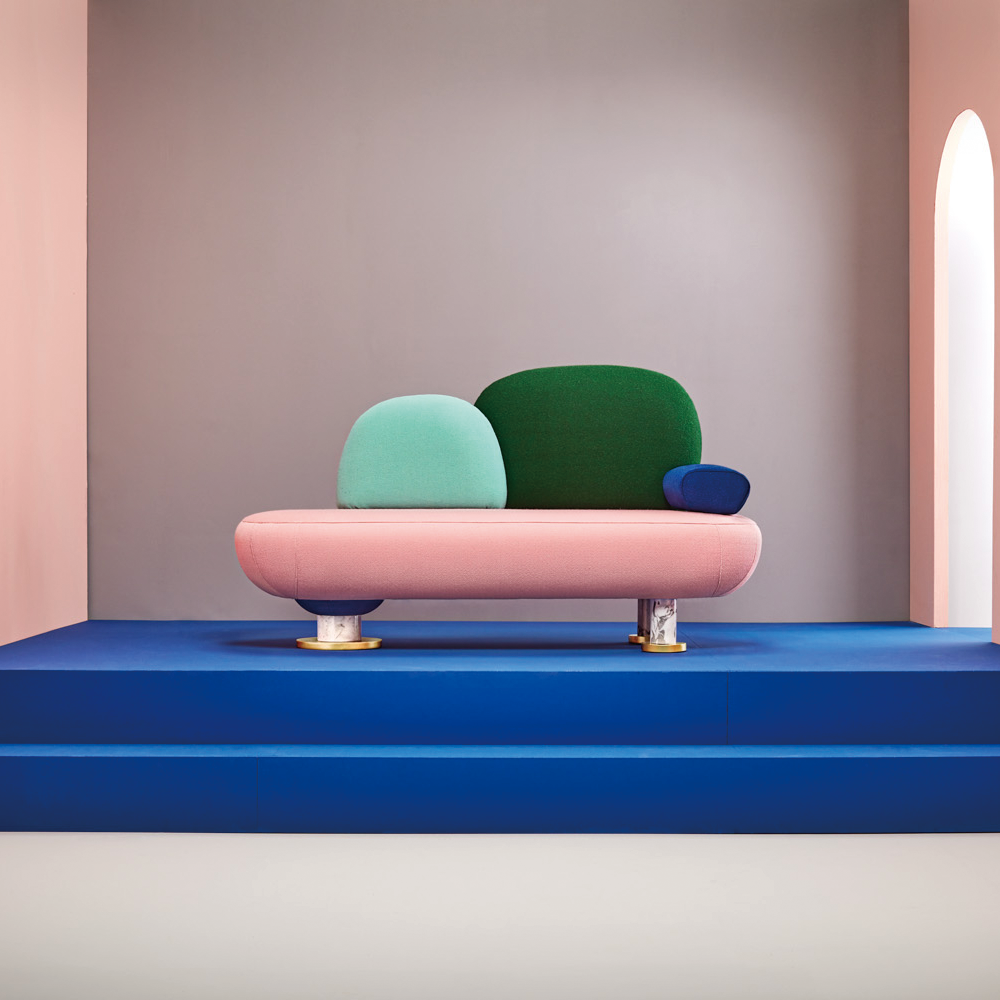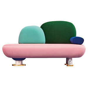 The Toadstool Sofa is a luxurious and sensual sofa. The standout design, with its bold colour scheme and organic shapes, is inspired by contemporary visual culture and graphic design. The sofa is embellished with details in mixed materials (metal, wood and marble), which complement the upholstery well. The Toadstool sofa is an outstandingly quirky design which would make a great focal point in any room.