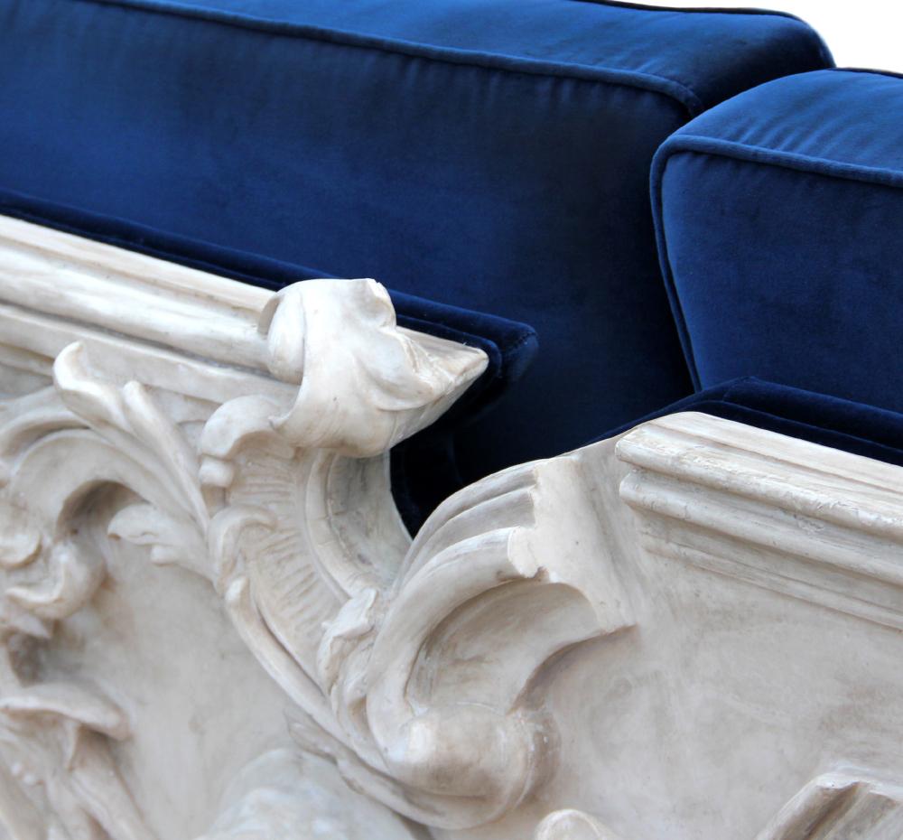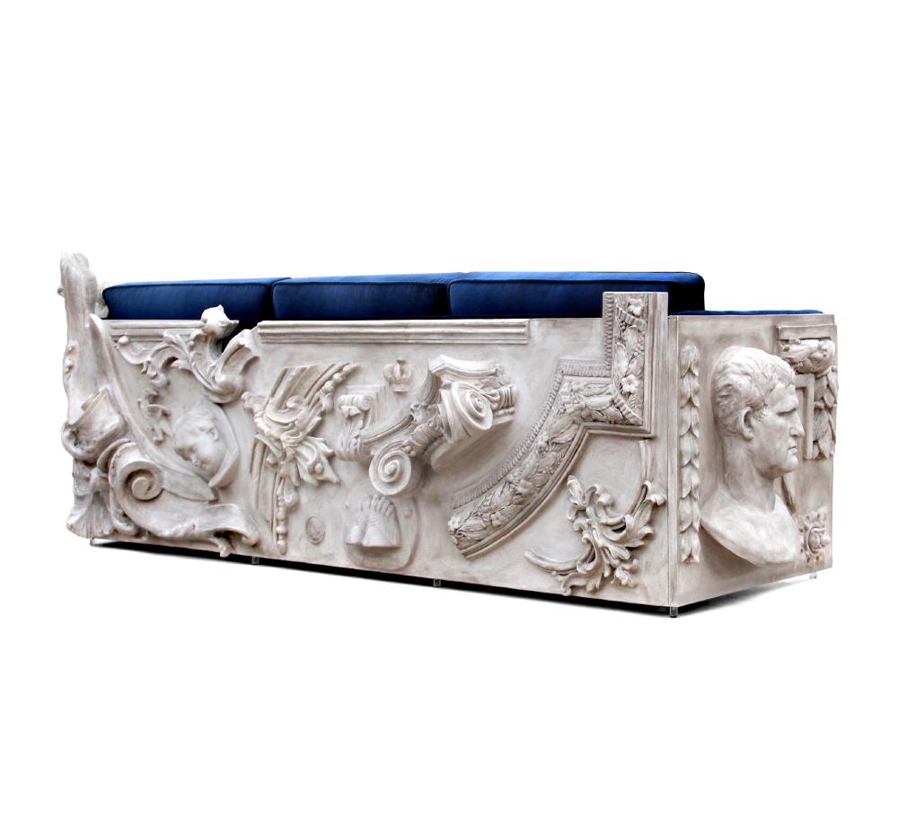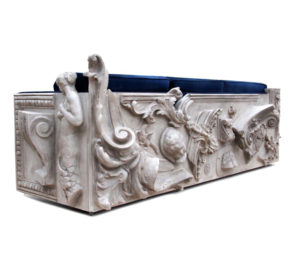The Versailles Sofa and Armchair Collection is inspired by the luxuries of the French royal palace of Versailles. Its shell replicates the marvellous and opulent stuccos of this historical palace, fabulously encasing the rich cushions of the seat, sides and back, all completely removable.