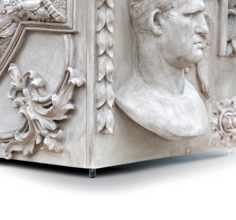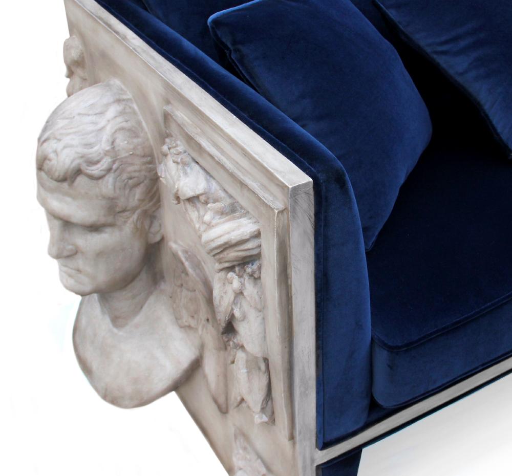 Materials: sofa and armchair in wood structure; panels in manually sculptured bas-relief, made in resin and finished with a restoration technique similar to stone carving; full upholstery covers all cushions - back, sides and seat; legs in turned acrylic