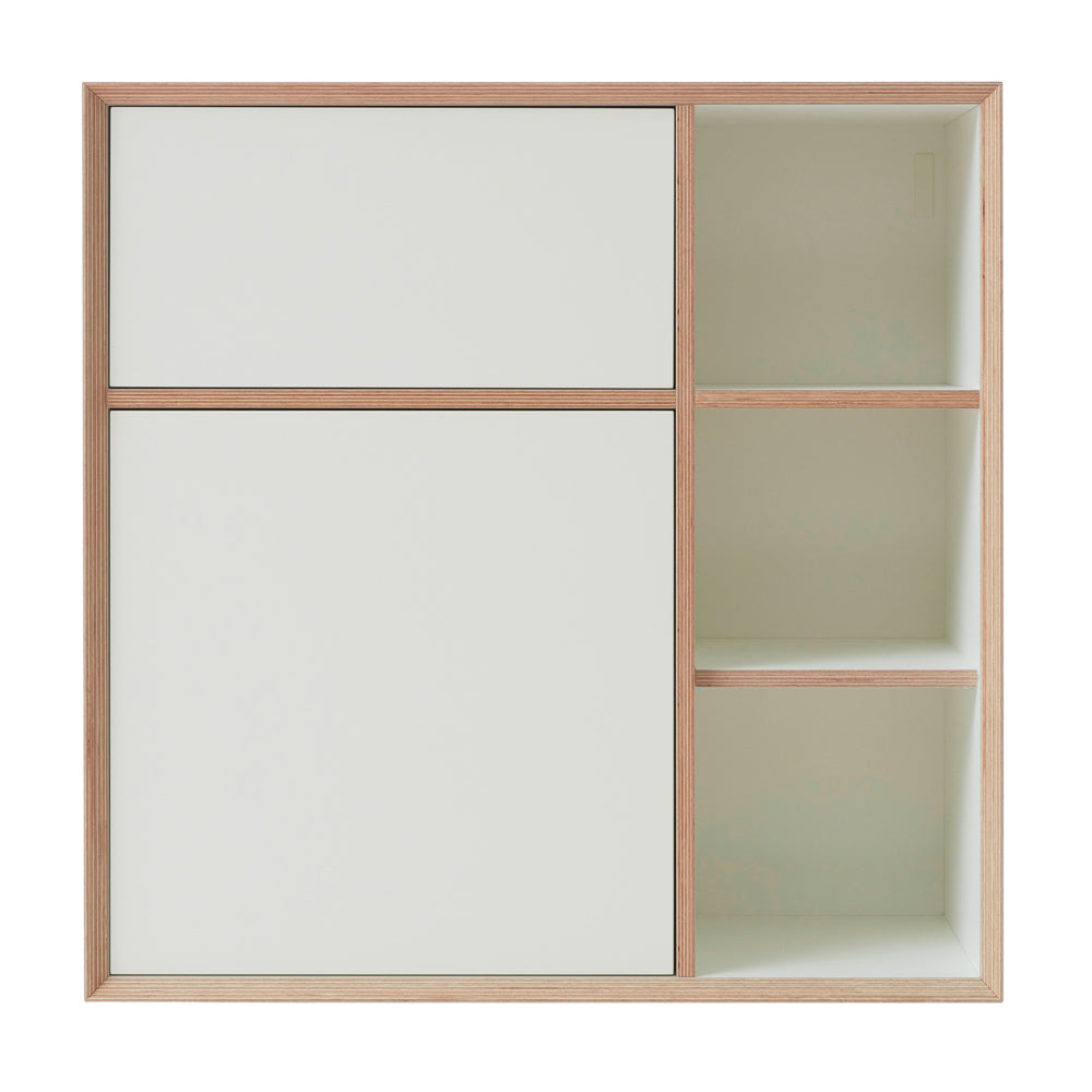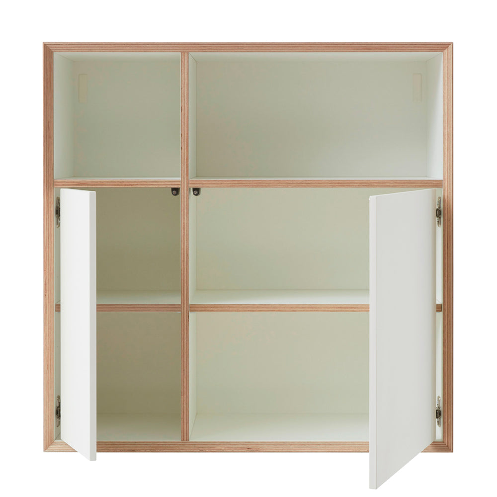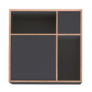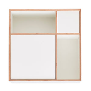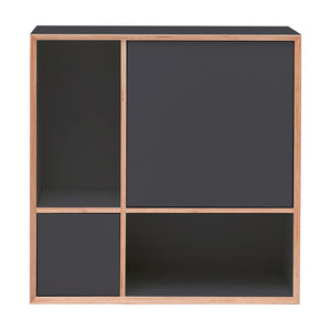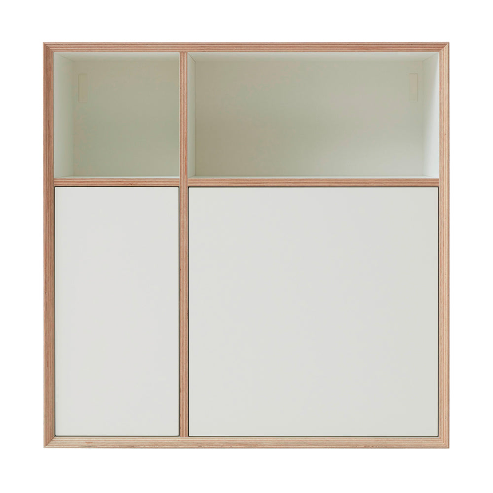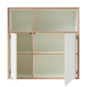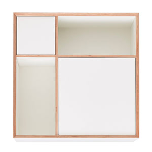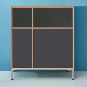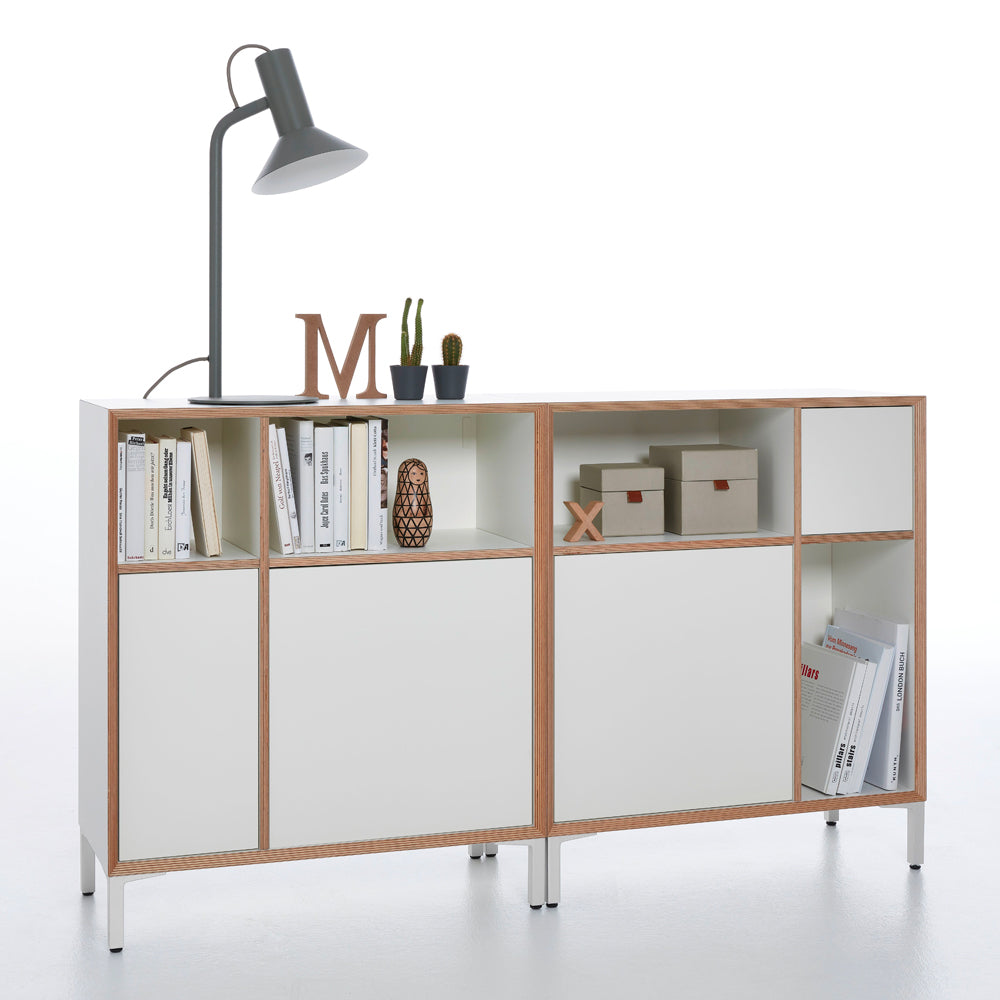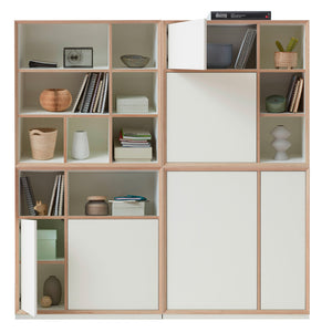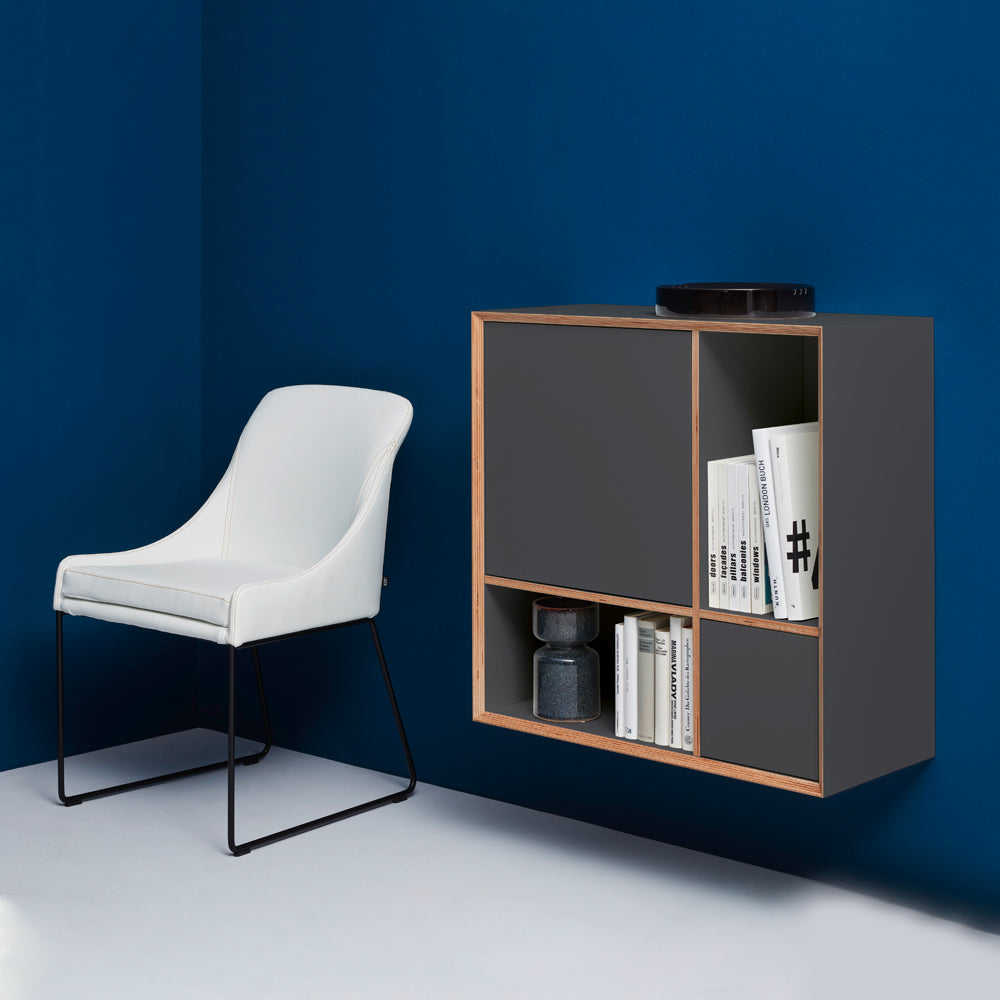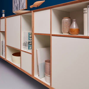 Vertiko is highly versatile shelving system based on a 74 cm x 74 cm box with 11 different versions, each with a different configuration of shelves and doors. The Vertiko shelves can be stacked on top of or placed alongside each other. They can be attached to the wall or be placed on the floor (with the addition of metal feet or a podium base), thus enabling countless different configurations to suit different needs, from an open book shelf to a bar cabinet.