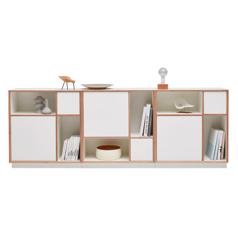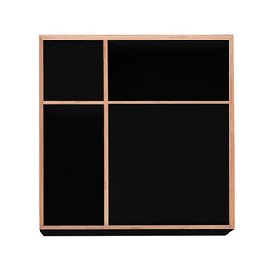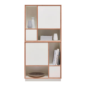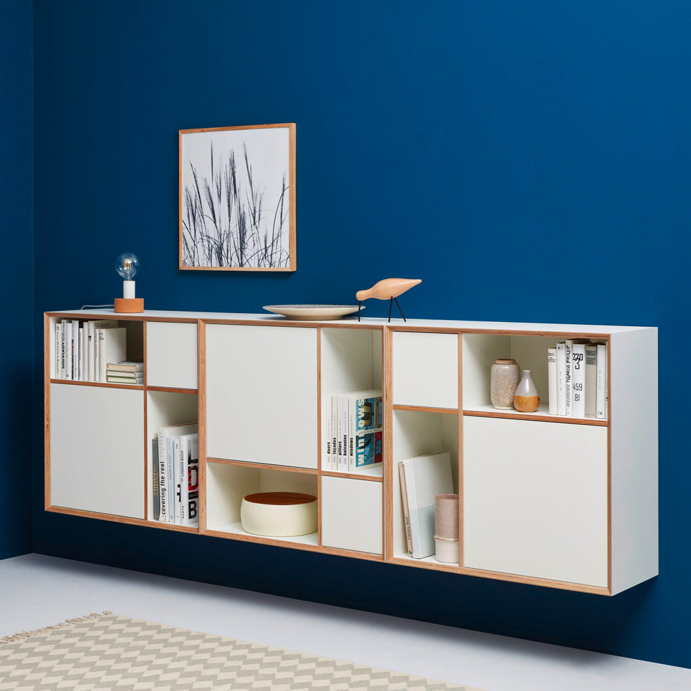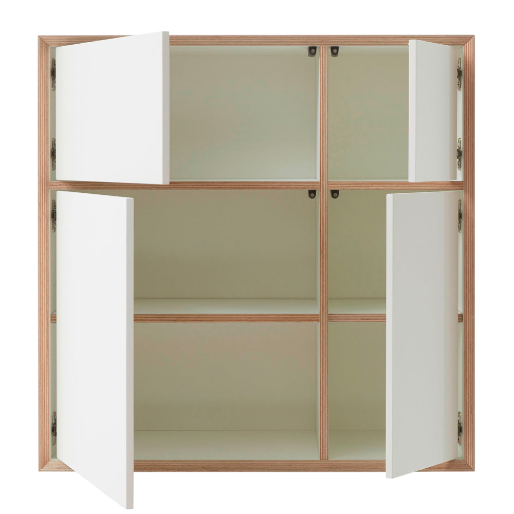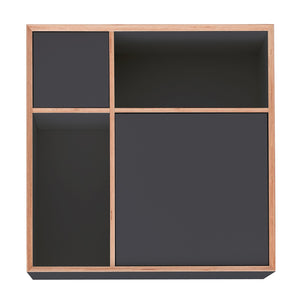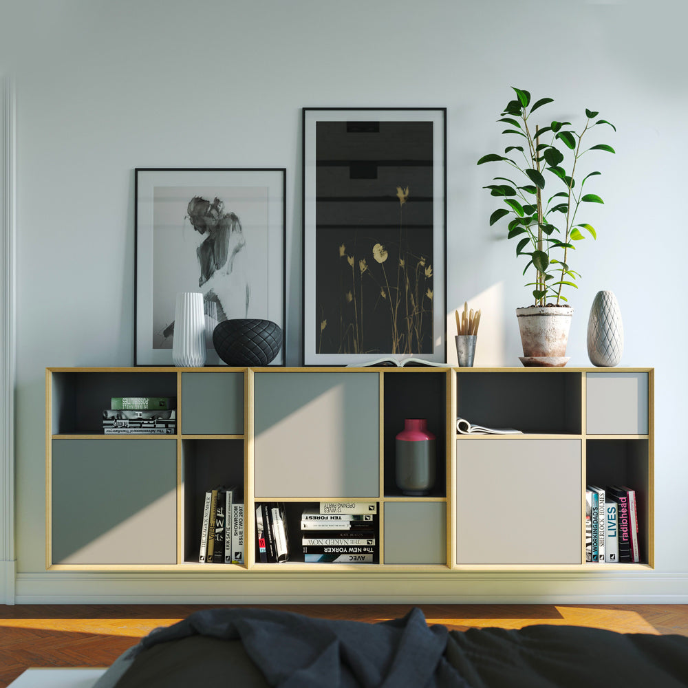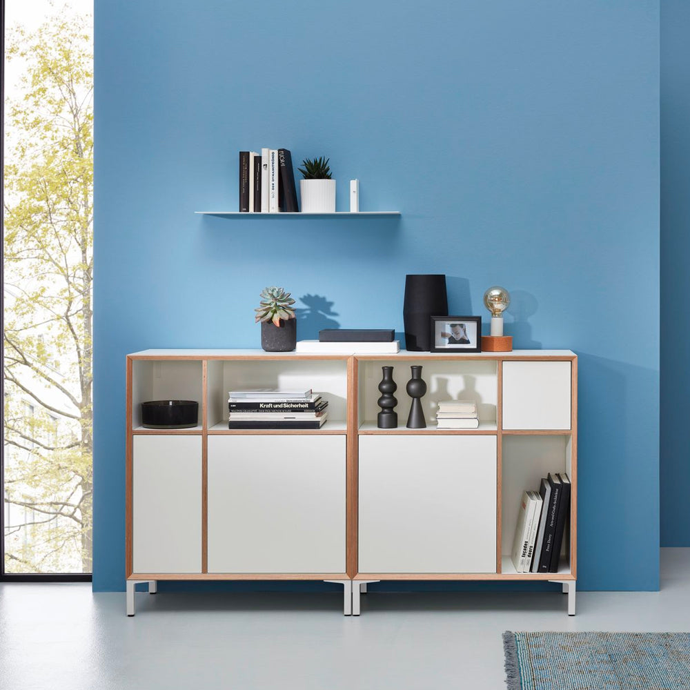 Vertiko is highly versatile shelving system based on a 74 cm x 74 cm box with 11 different versions, each with a different configuration of shelves and doors. The Vertiko shelves can be stacked on top of or placed alongside each other. They can be attached to the wall or be placed on the floor (with the addition of metal feet or a podium base), thus enabling countless different configurations to suit different needs, from an open book shelf to a bar cabinet.