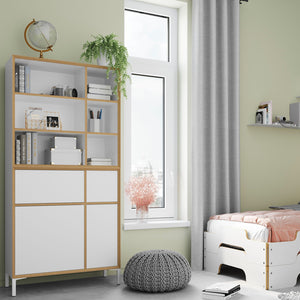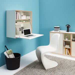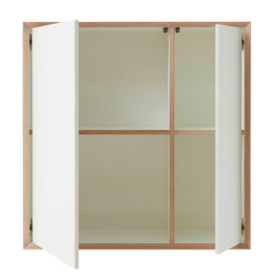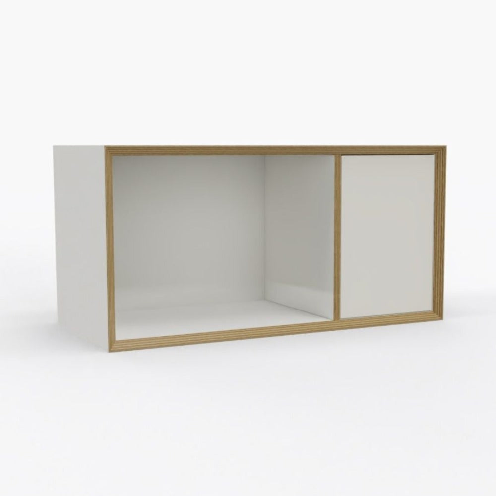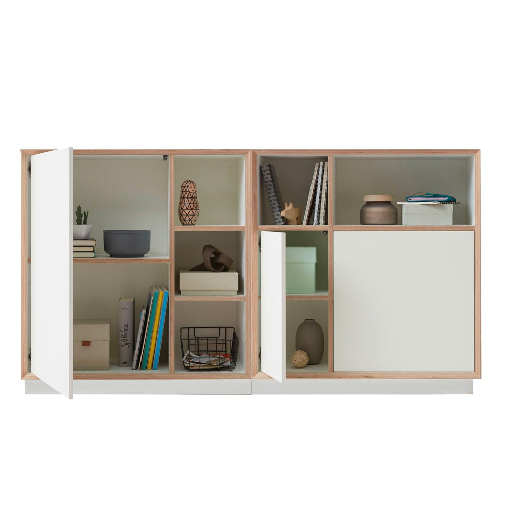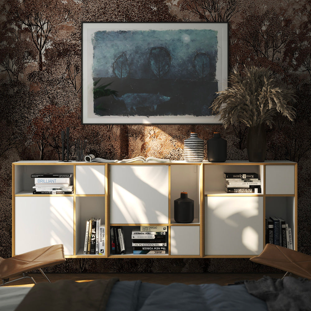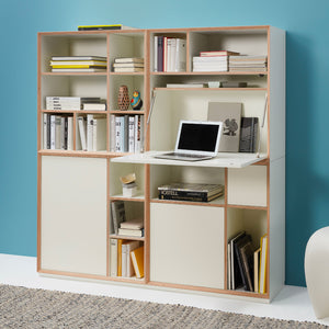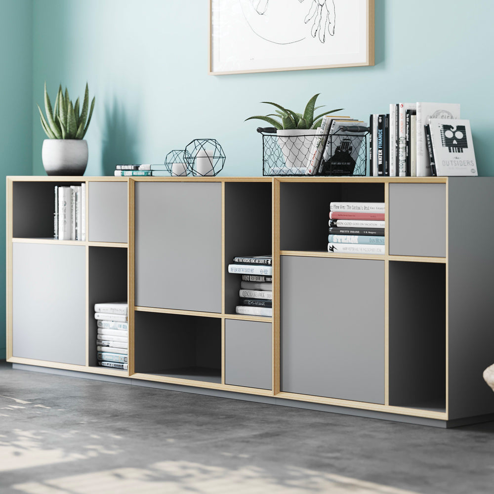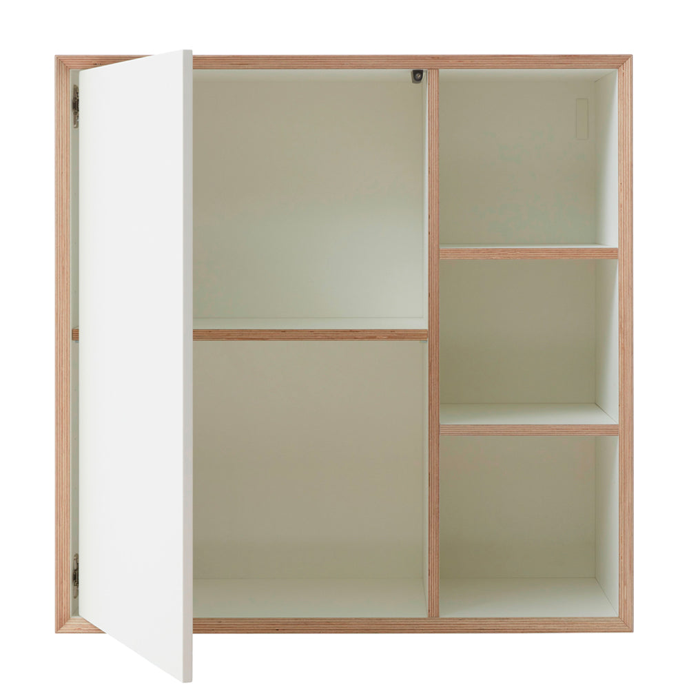 Vertiko is highly versatile shelving system based on a 74 cm x 74 cm box with 11 different versions, each with a different configuration of shelves and doors. The Vertiko shelves can be stacked on top of or placed alongside each other. They can be attached to the wall or be placed on the floor (with the addition of metal feet or a podium base), thus enabling countless different configurations to suit different needs, from an open book shelf to a bar cabinet.