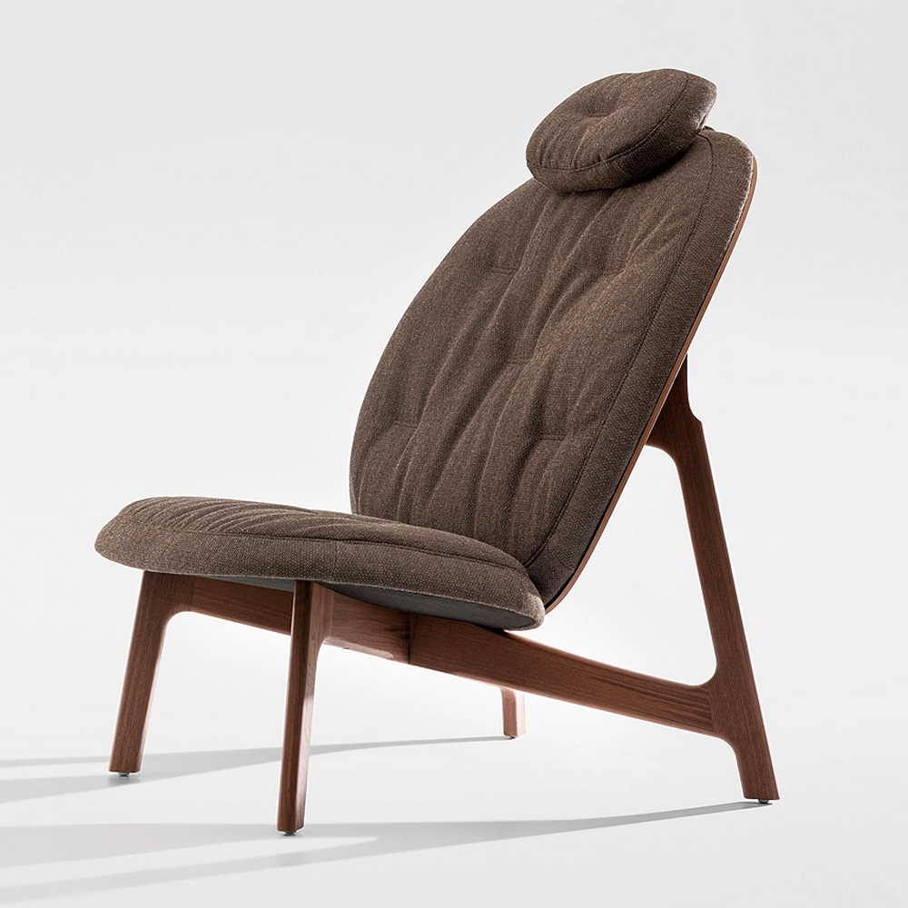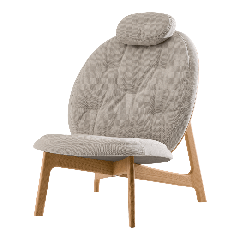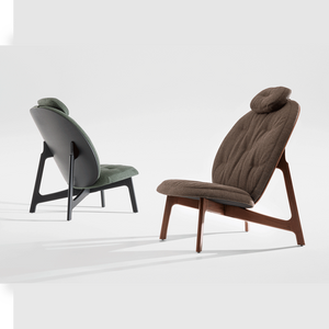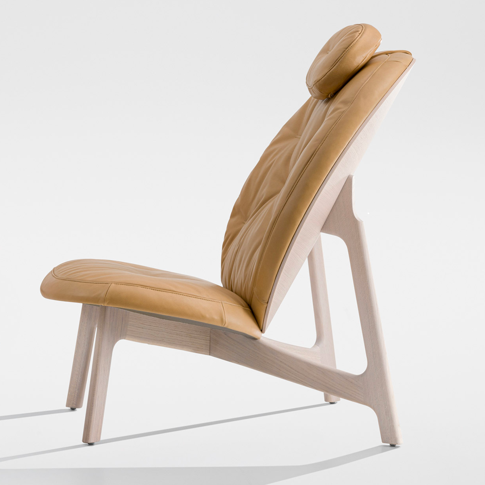 The distinctive shapes of the seat and backrest of the Zenso High Lounge Chair are inspired by the "Ensõ", a motif common in Japanese calligraphy which symbolises enlightenment and elegance. The seat and backrest are supported by a solid wood frame with hind legs that extend upwards to support the backrest, a bold design which gives the lounge chair a strong, imposing presence. The Zenso High Lounge Chair comes with an adjustable head cushion, which adds to the high level of comfort.